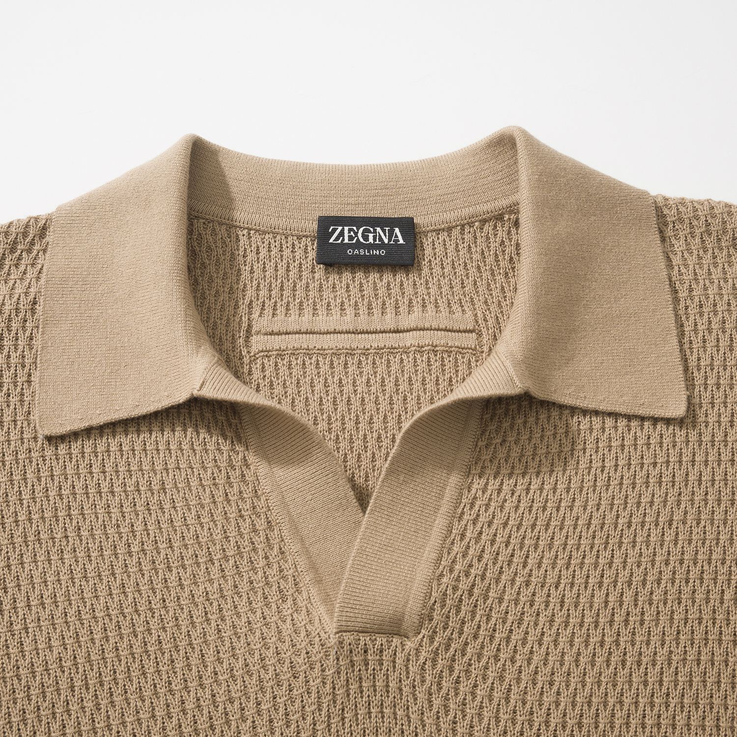 Áo Polo cotton cao cấp màu kaki mới của Zegna mùa này được làm từ chất liệu cotton cao cấp độc quyền của Zegna, thanh lịch, vượt thời gian và bền bỉ, thể hiện sự quyến rũ của trang phục thường ngày tinh tế. Cổ áo polo kiểu mở tạo thêm vẻ thoải mái cho kiểu dáng tay ngắn cổ điển. Sợi cotton cao cấp được sử dụng trong loại áo này chỉ được chọn lọc từ những sợi cotton dài, vừa chắc chắn, mềm mại và bền bỉ, mang đến chất liệu cao cấp cho phong cách hàng ngày. Viền và cổ tay áo bo gân. Chất liệu: 100% cotton,