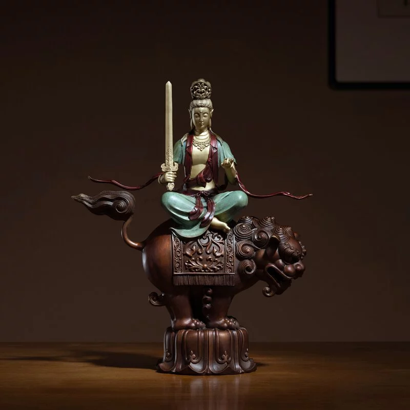 Bồ tát Văn Thù là thị giả bên trái của Thích Ca Mâu Ni, tượng trưng cho trí tuệ của Phật, cùng với Bồ tát Phổ Hiền và Thích Ca Mâu Ni Phật được gọi là “Hoa Nghiêm Tam Thánh”, phần lớn tượng của các Ngài đều cưỡi sư tử, cầm kiếm, trên đầu buộc năm cái bánh. Còn được gọi là “Đại Trí Văn Thù”, Ngài đã lập đức bằng trí tuệ