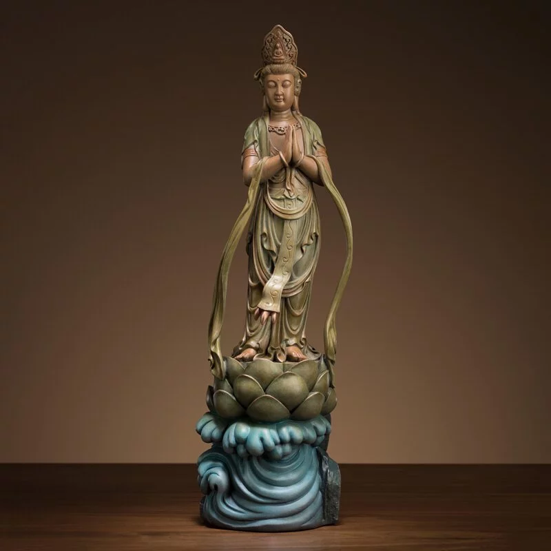 Chắp tay đứng thẳng trên đài sen, uyển chuyển sang trọng với y phục tao nhã. Bồ Tát Quán Thế Âm là biểu tượng của lòng từ bi và trí tuệ