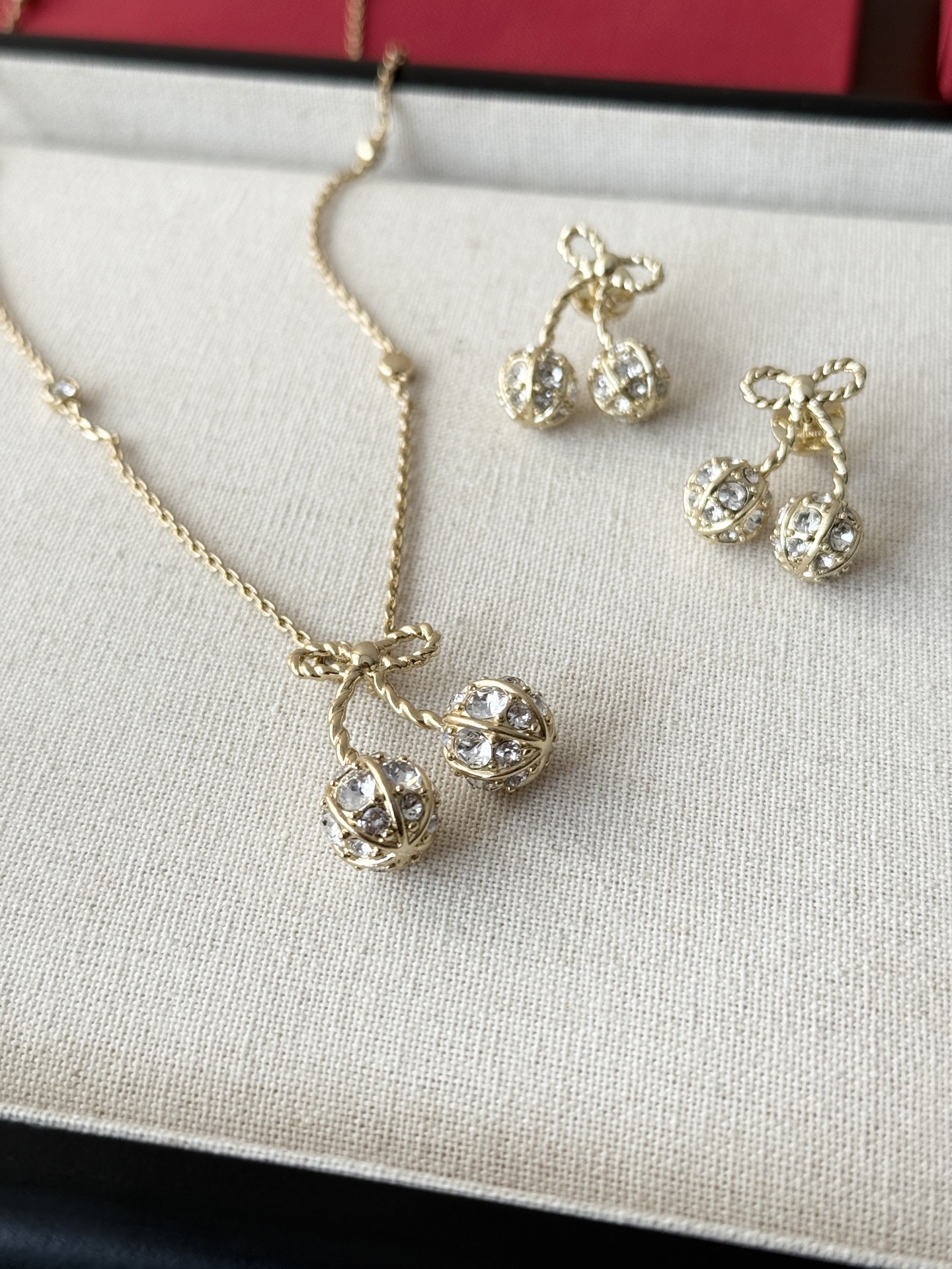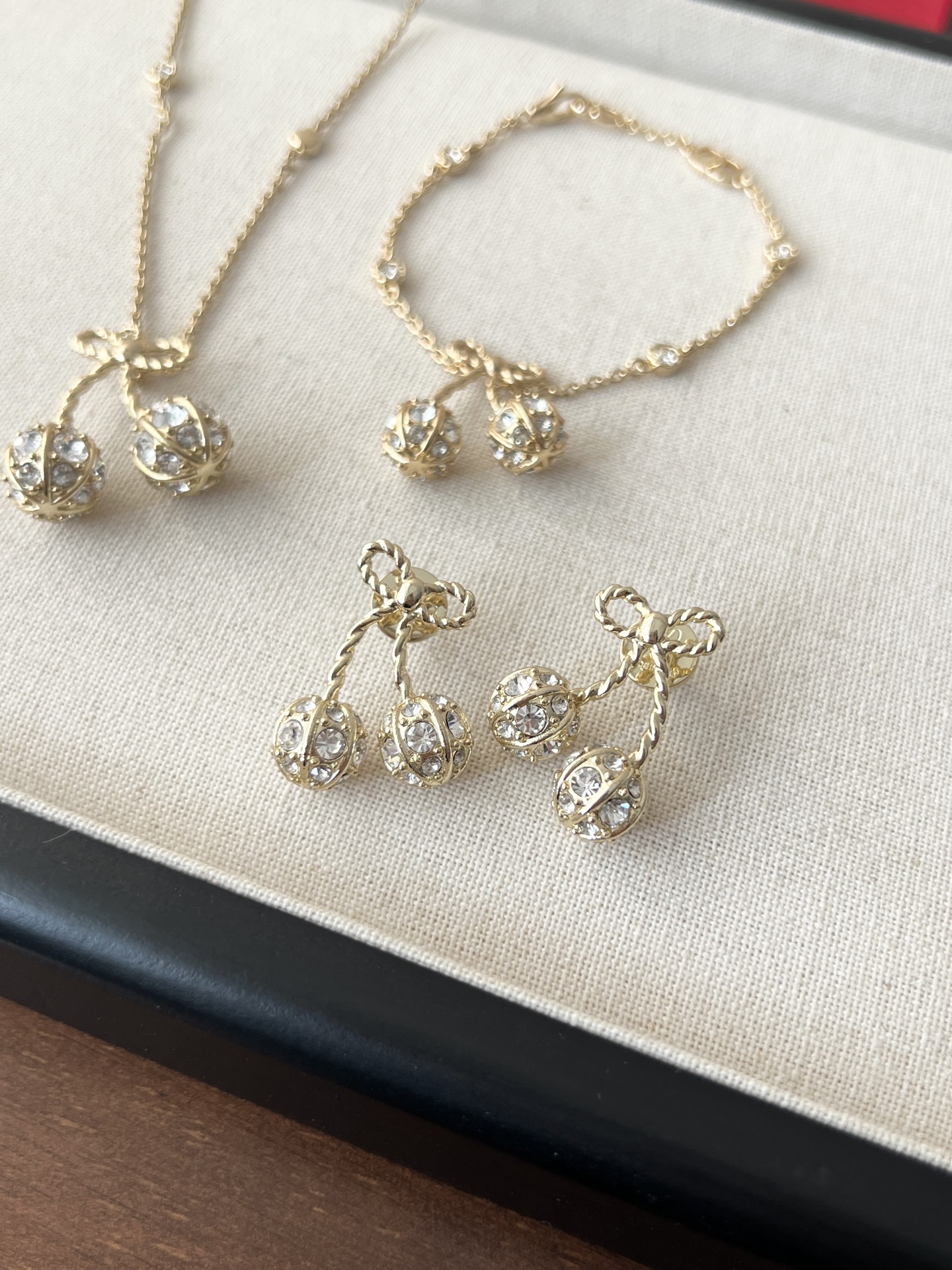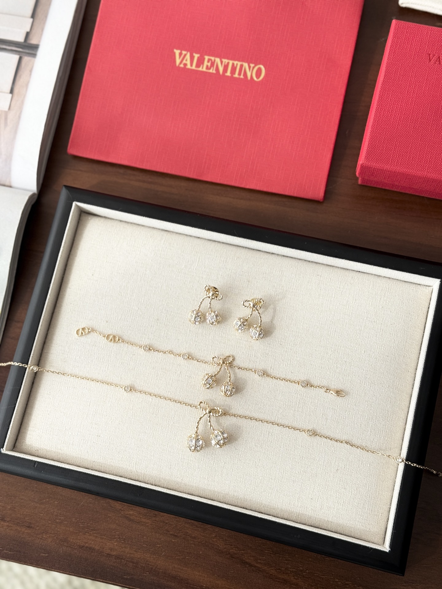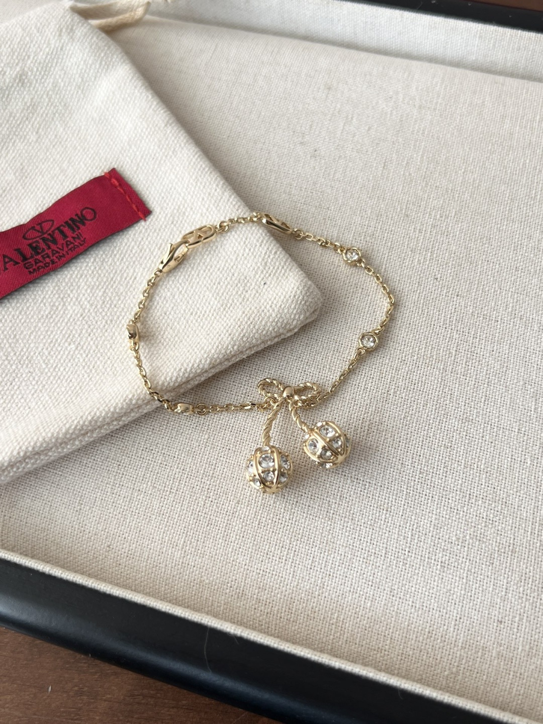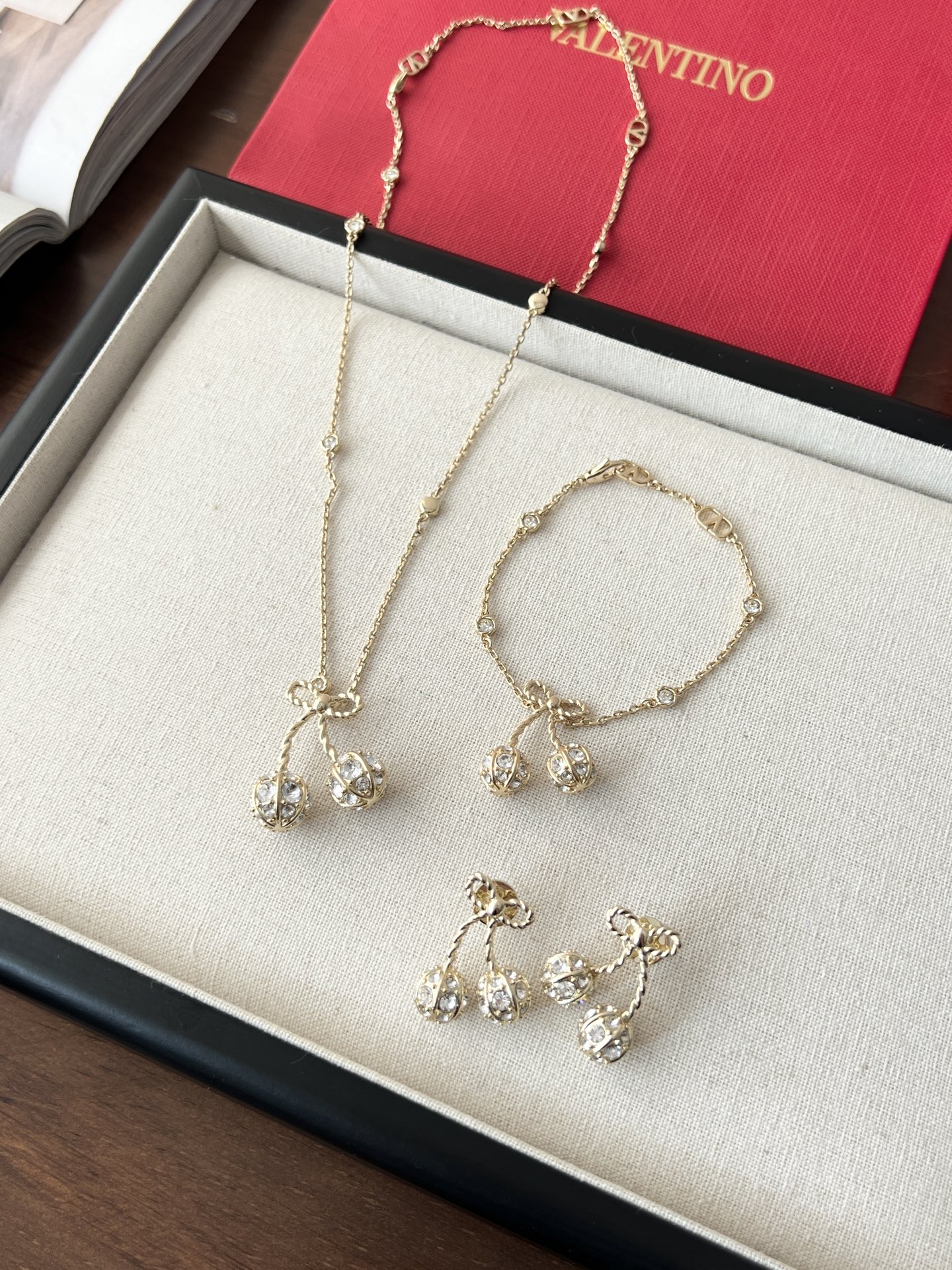 Thiết kế hoa anh đào vàng của Valentino nhỏ nhắn và tinh tế, được đính những viên kim cương pha lê Swarovski lấp lánh trải khắp thân vòng. Chất liệu vải xù 360 độ phản chiếu ánh sáng rực rỡ, khiến nó trở nên lấp lánh và đáng yêu! Con bướm thắt nút vàng tạo nên bầu không khí ngọt ngào và tinh nghịch với một chút lãng mạn, toát lên khí chất của một tiểu thư giàu có. Các nàng tiên nhỏ nhất định không thể bỏ lỡ! Màu vàng trắng làm sáng da và toát lên vẻ sang trọng ngay từ cái nhìn đầu tiên. Hoàn hảo cho bất kỳ khoảnh khắc nào bạn muốn thêm một chút lãng mạn và tinh tế vào trang phục của mình. Đây là một món đồ trang sức hàng ngày không cần suy nghĩ, toát lên vẻ quyến rũ và thanh lịch mỗi khi bạn ra ngoài! Phần kim loại được làm bằng đồng thau mạ vàng dày, bề mặt tinh xảo và hiệu ứng mạ điện đạt đến mức tối đa. Nó mang một vẻ quý phái và sang trọng, cũng như có đặc tính chống oxy hóa và chống ăn mòn, giúp giảm nguy cơ dị ứng khi đeo! Chiều dài vòng tay: 17cm Chiều dài dây chuyền: 40cm Dây nối dài: 13cm Kích thước bông tai: 2.5cm