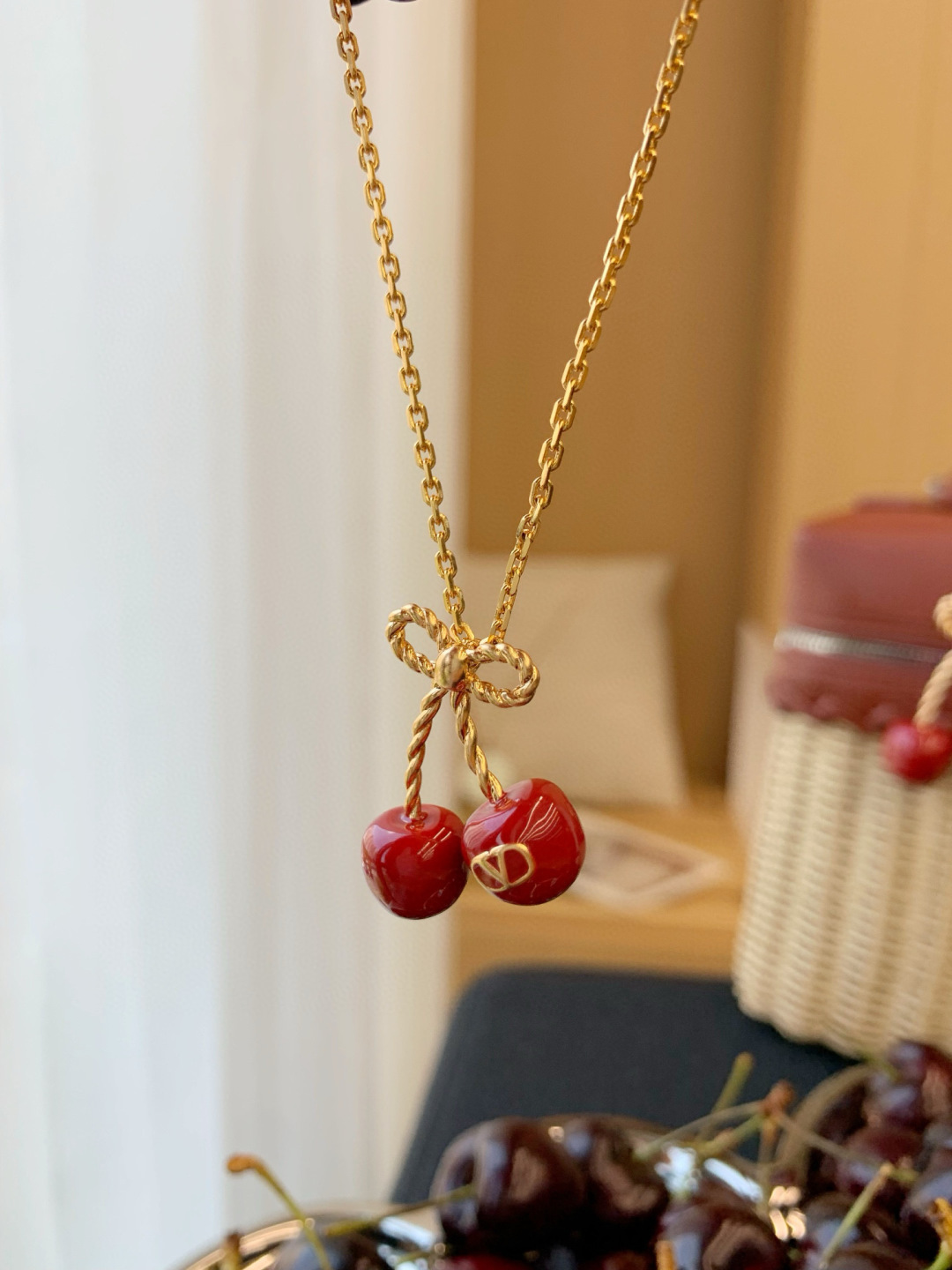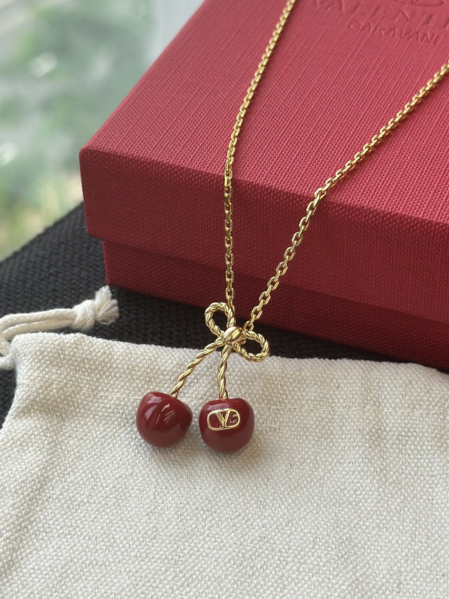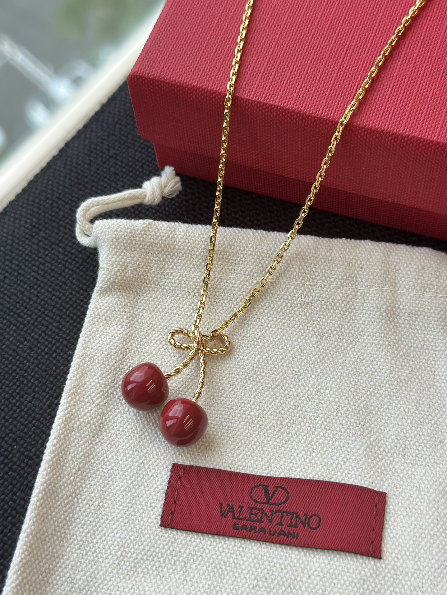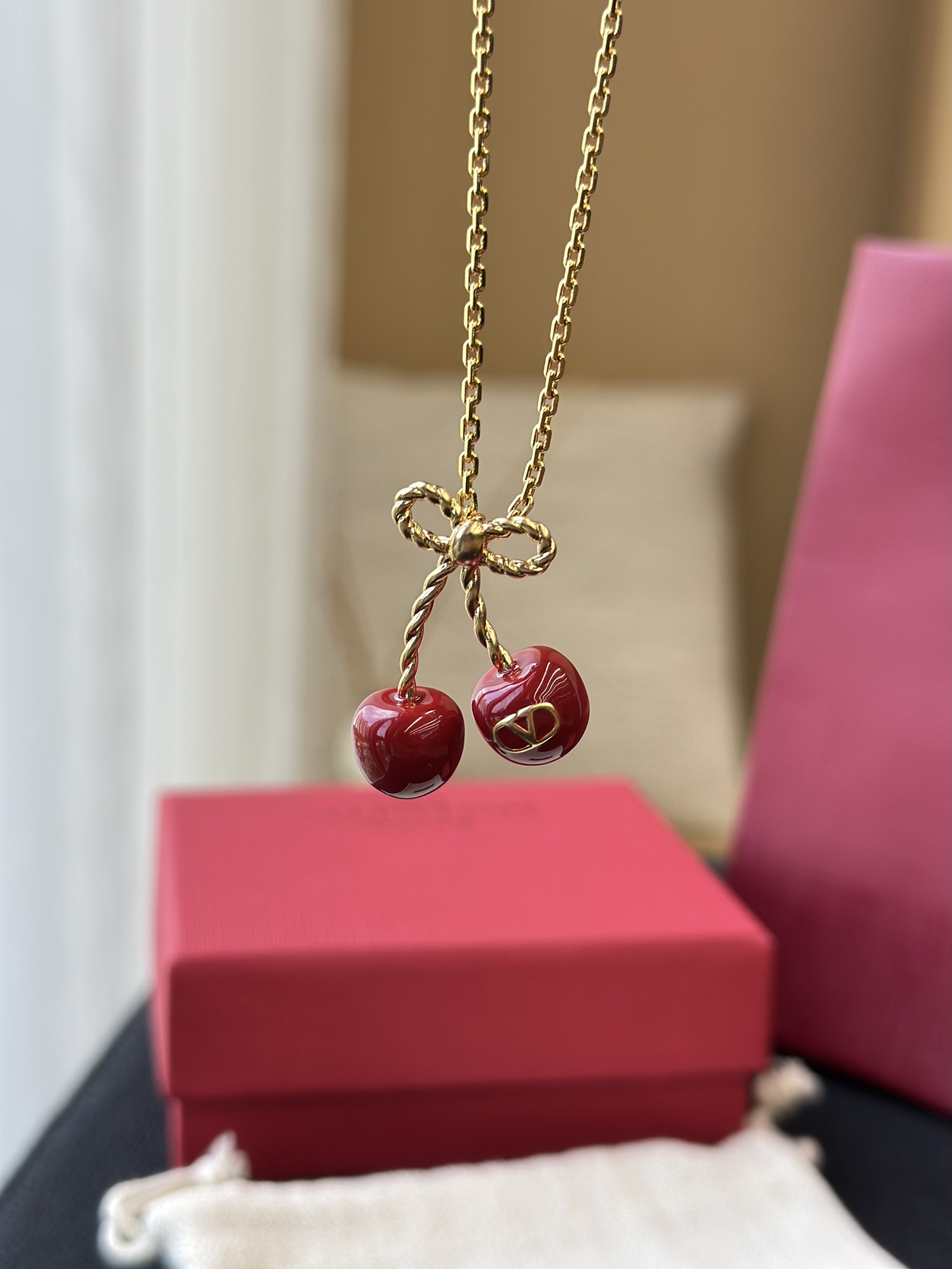 Mặt dây chuyền hình quả anh đào kỷ niệm 25 năm của Valentino là món đồ không thể thiếu cho mùa hè!!!! Một chiếc nơ vàng nhỏ kết hợp với quả anh đào đỏ tráng men, được tô điểm bằng một chiếc móc khóa hình chữ V tinh tế, vừa tinh nghịch vừa thanh lịch, mang phong cách cao cấp dễ dàng phối hợp Dây chuyền có thể điều chỉnh độ dài