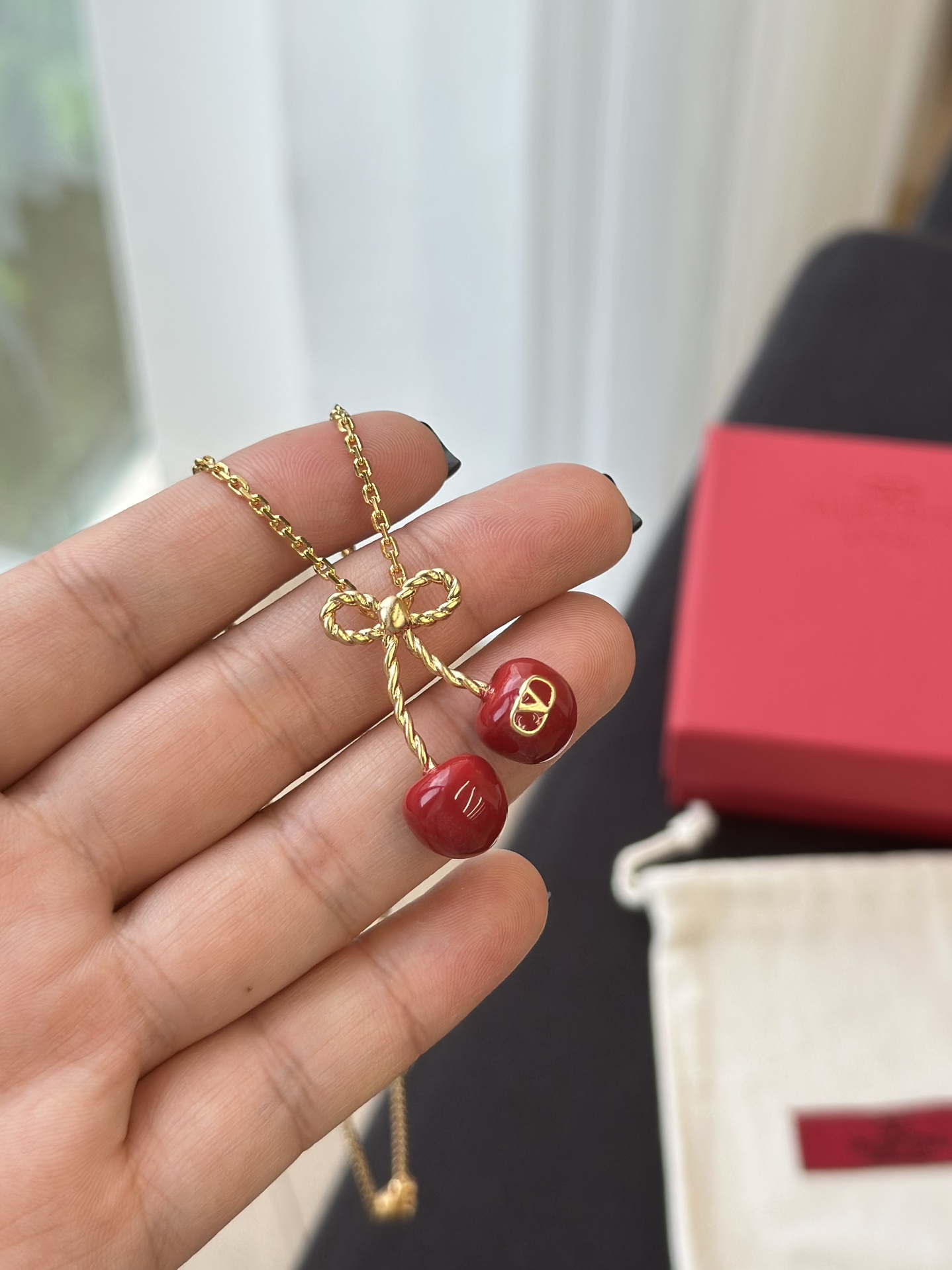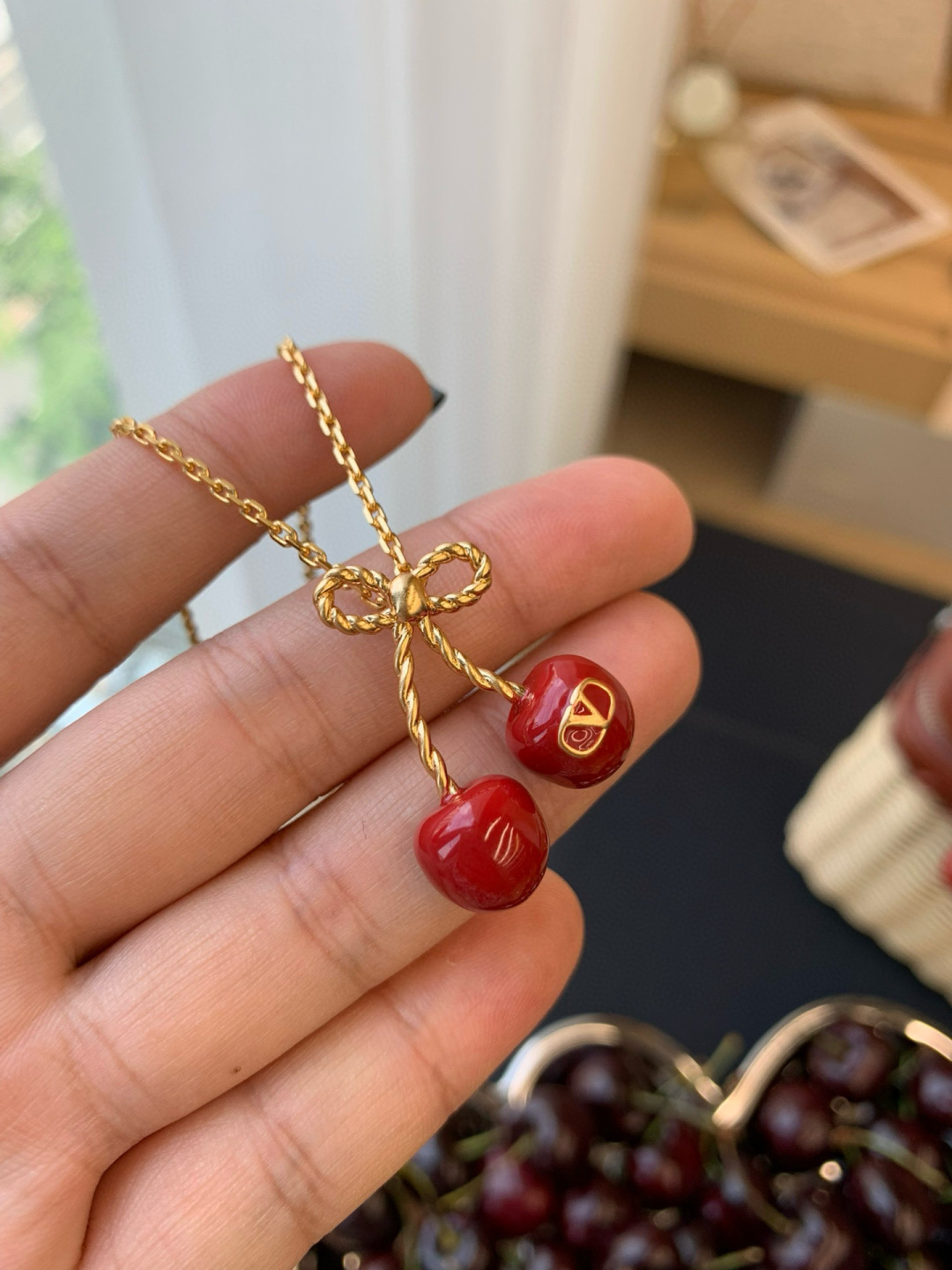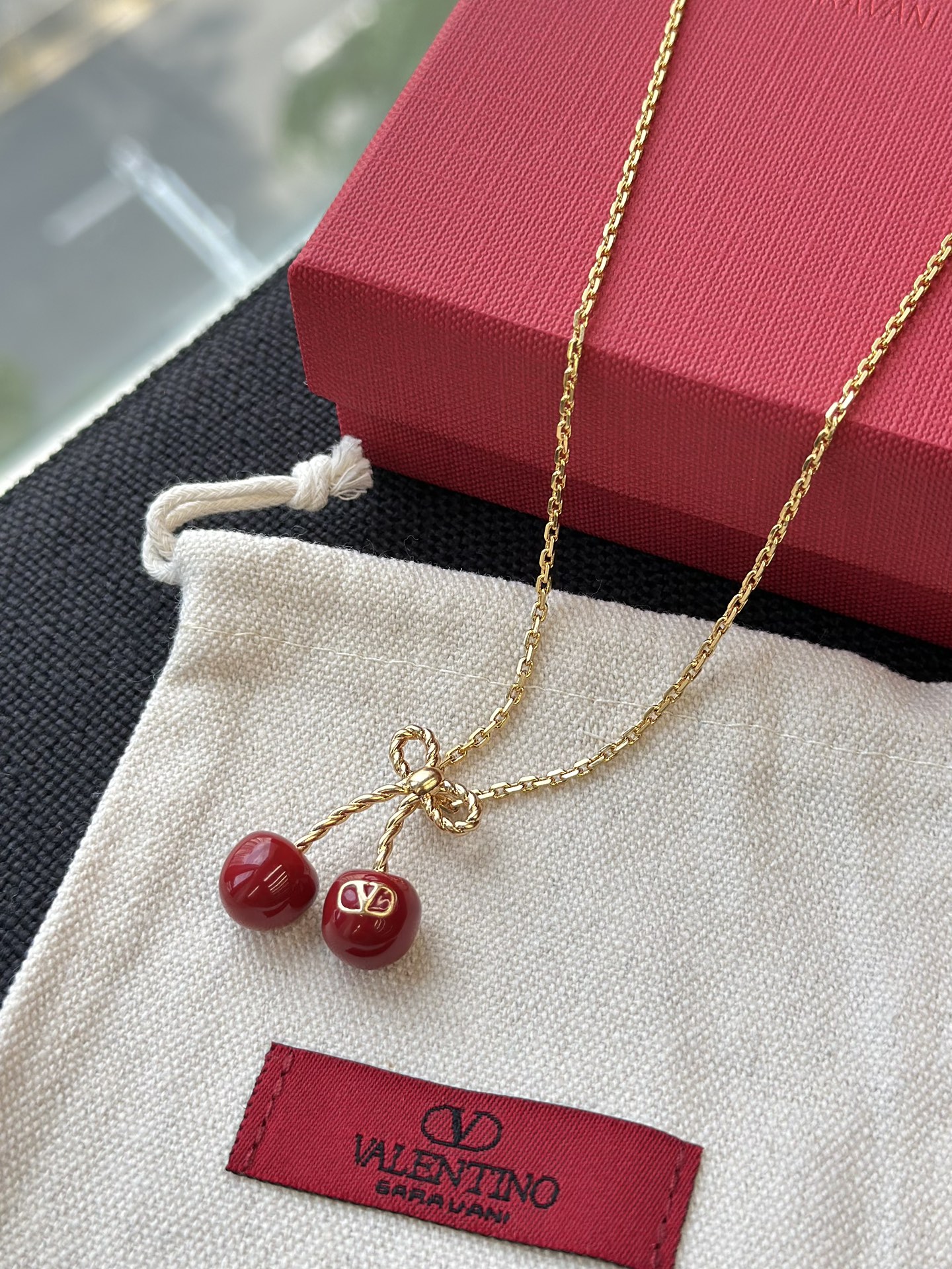 Mặt dây chuyền hình quả anh đào kỷ niệm 25 năm của Valentino là món đồ không thể thiếu cho mùa hè!!!! Một chiếc nơ vàng nhỏ kết hợp với quả anh đào đỏ tráng men, được tô điểm bằng một chiếc móc khóa hình chữ V tinh tế, vừa tinh nghịch vừa thanh lịch, mang phong cách cao cấp dễ dàng phối hợp Dây chuyền có thể điều chỉnh độ dài