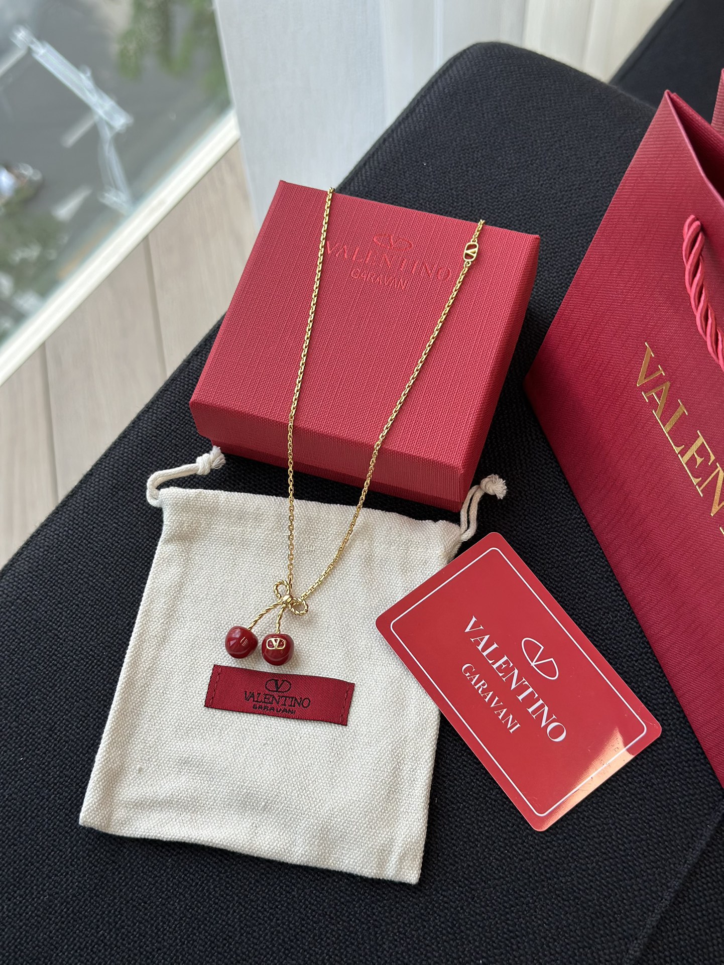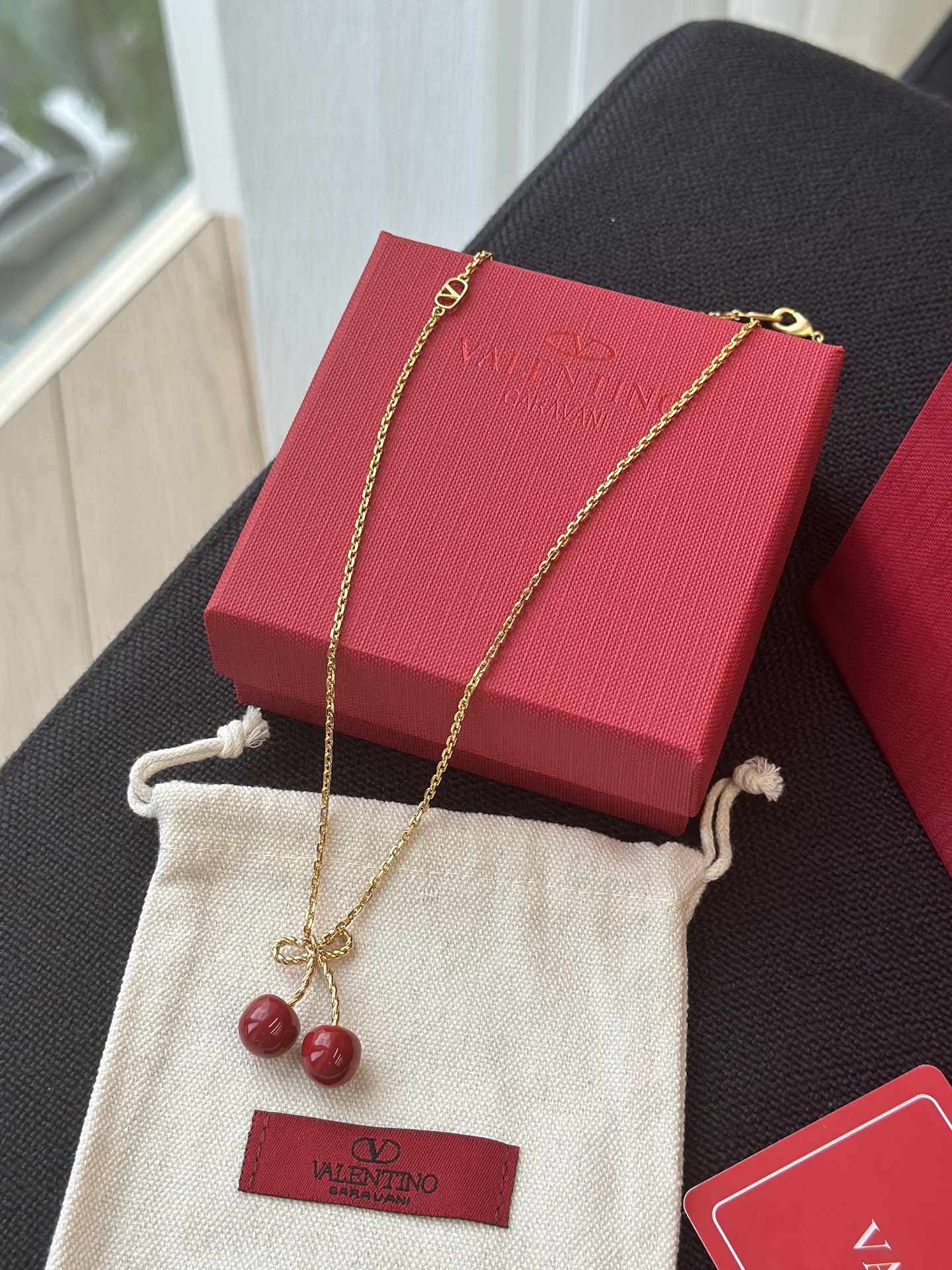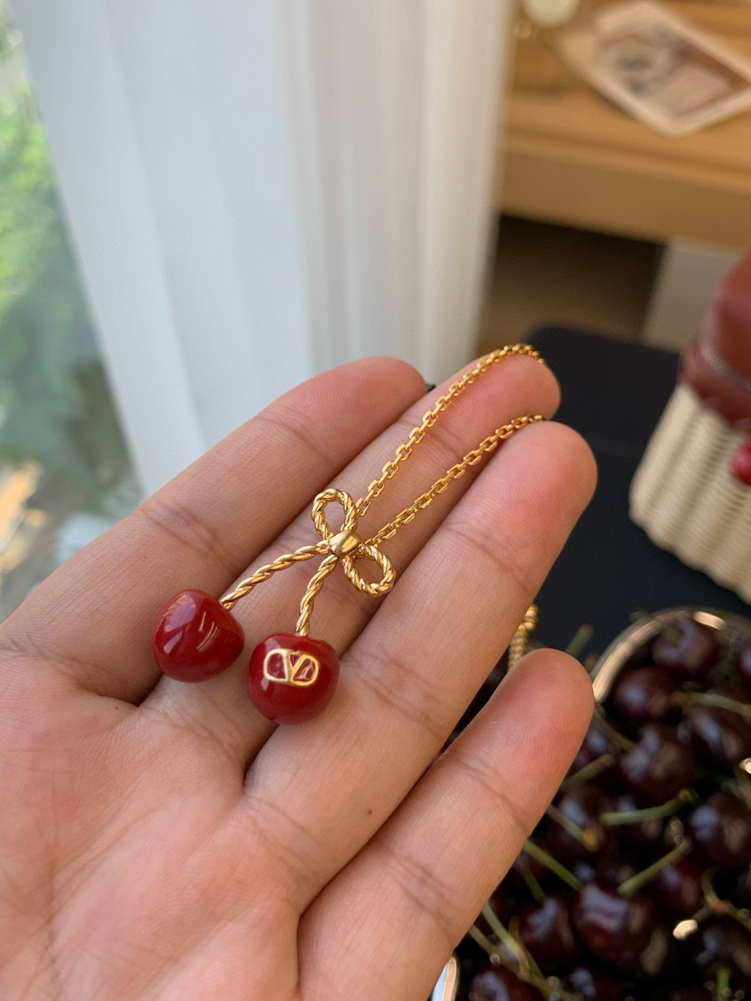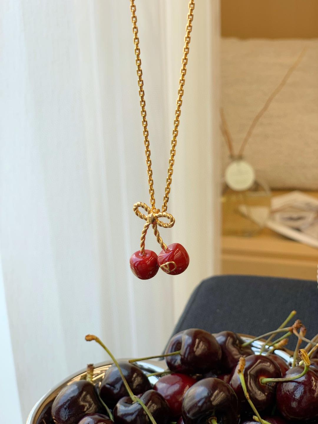 Mặt dây chuyền hình quả anh đào kỷ niệm 25 năm của Valentino là món đồ không thể thiếu cho mùa hè!!!! Một chiếc nơ vàng nhỏ kết hợp với quả anh đào đỏ tráng men, được tô điểm bằng một chiếc móc khóa hình chữ V tinh tế, vừa tinh nghịch vừa thanh lịch, mang phong cách cao cấp dễ dàng phối hợp Dây chuyền có thể điều chỉnh độ dài