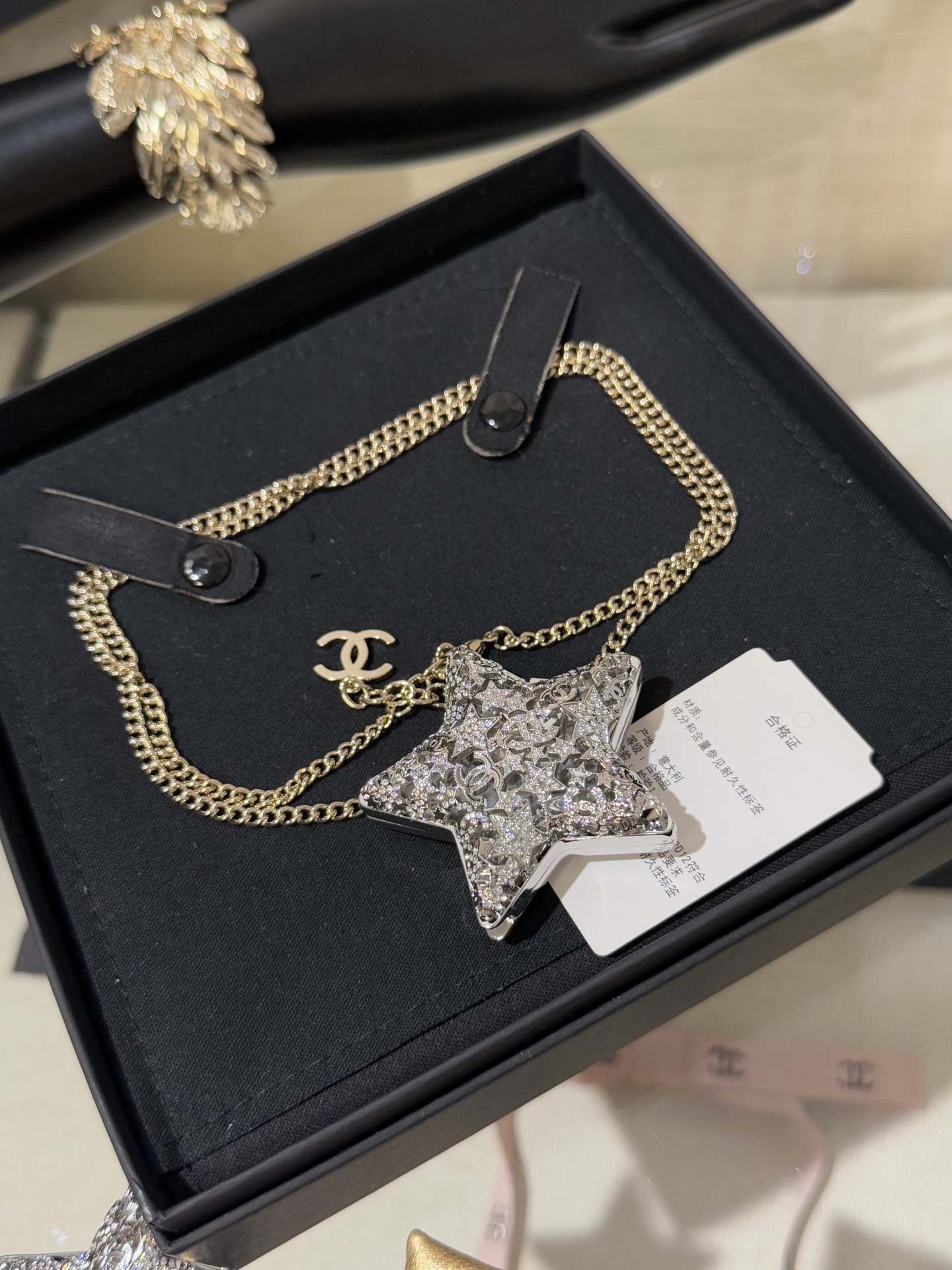 DÂY CHUYỀN CHANEL STAR BAG DIAMOND.Dây chuyền túi xách Chanel 25A mới, thiết kế rỗng hình ngôi sao đính đá pha lê và chữ C kép, phối màu vàng và bạc. Hình ngôi sao rỗng đính đá pha lê kết hợp với hình ngũ giác, tạo hiệu ứng thị giác ấn tượng. Rất thích hợp để đeo trong các dịp xã giao, lấp lánh, bắt mắt và sang trọng.
