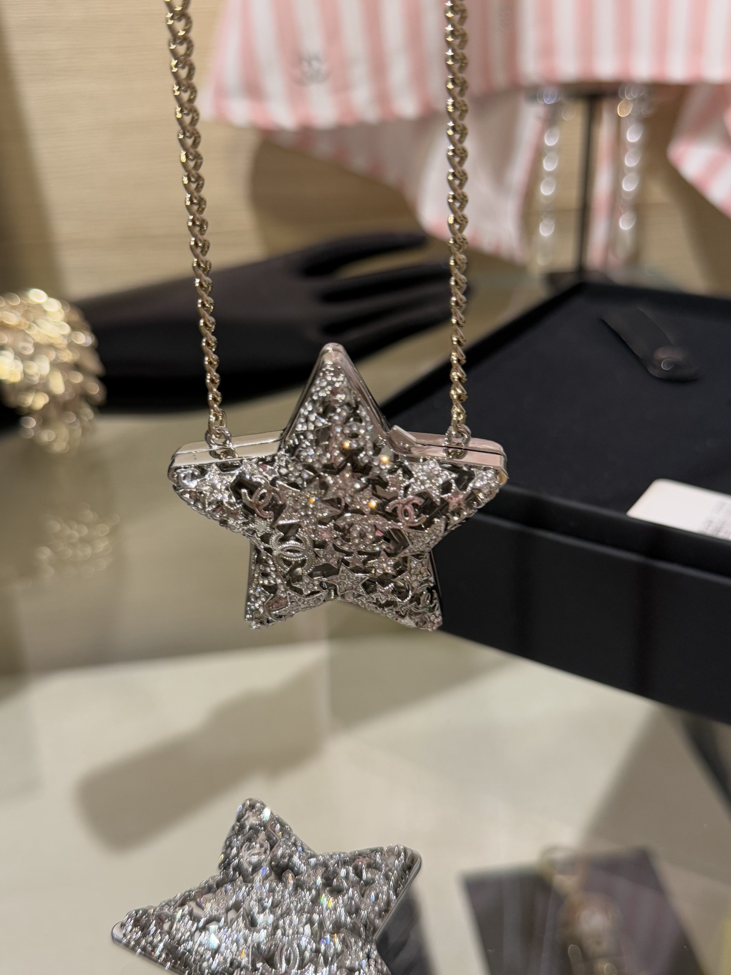 THÔNG SỐ SẢN PHẨM DÂY CHUYỀN CHANEL STAR BAG DIAMOND.Dây chuyền túi xách Chanel 25A mới, thiết kế rỗng hình ngôi sao đính đá pha lê và chữ C kép, phối màu vàng và bạc. Hình ngôi sao rỗng đính đá pha lê kết hợp với hình ngũ giác, tạo hiệu...