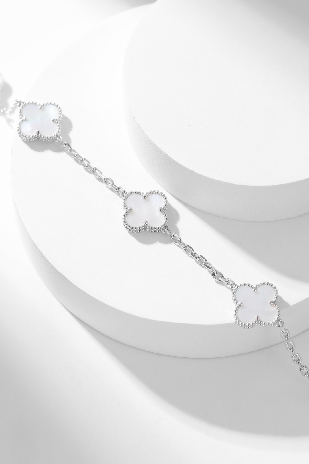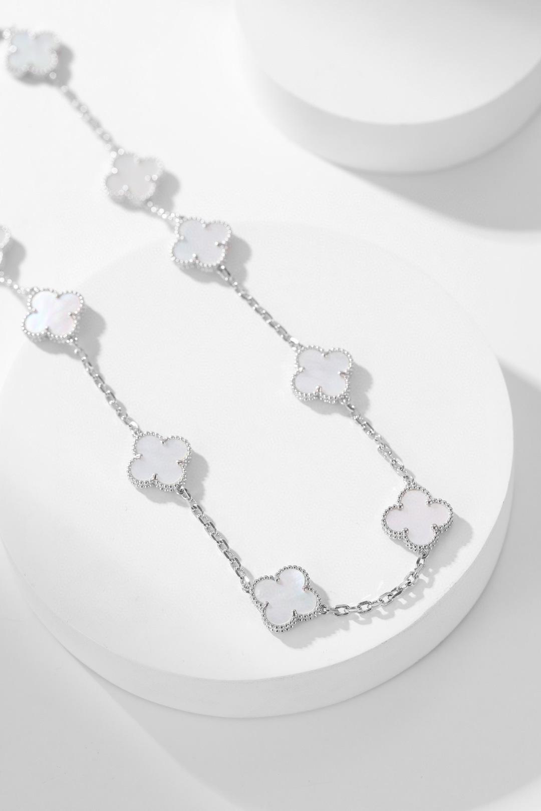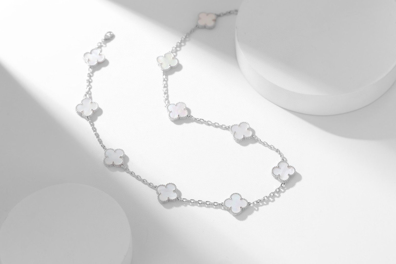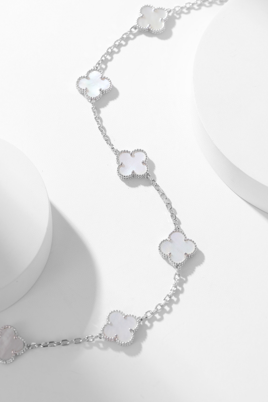 DÂY CHUYỀN VAN CLEEF & ARPELS PEARLS NGỌC TRAI TRẮNG.May mắn nở rộ, một dải ngân hà trên cổ tay bạn—dây chuyền cỏ bốn lá mười hoa đang là món đồ cực kỳ thịnh hành hiện nay. Chiếc dây chuyền cỏ bốn lá mười hoa này không chỉ là một món trang sức, mà còn là biểu tượng của sự may mắn và một lời chúc tốt đẹp. Dù trong những dịp quan trọng hay cuộc sống thường ngày, nó đều có thể tô điểm thêm vẻ quyến rũ độc đáo cho bạn. Hãy tự thưởng cho mình để đền đáp những nỗ lực đã bỏ ra; tặng nó cho người thân yêu để truyền tải tình yêu và lời chúc phúc. Hãy để may mắn này nở rộ mãi mãi trên cổ tay bạn. Và màu kim loại độc đáo, khác biệt so với các thương hiệu khác, cho phép bạn kết nối với người thân yêu một cách tự nhiên, không chút khó xử. Phiên bản xà cừ trắng: Xà cừ trắng có độ bóng mềm mại, tinh khiết và thanh lịch. Giống như sương mai, nó nhẹ nhàng bao bọc lấy cỏ bốn lá may mắn, mang đến cho bạn một khí chất tươi mới và tinh tế, thể hiện sự dịu dàng và năng động.