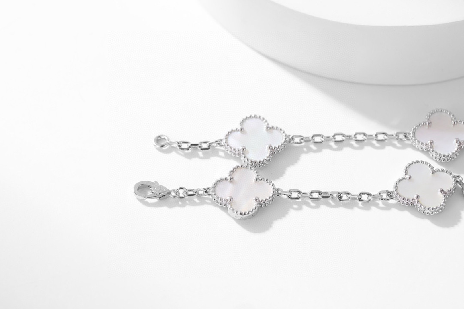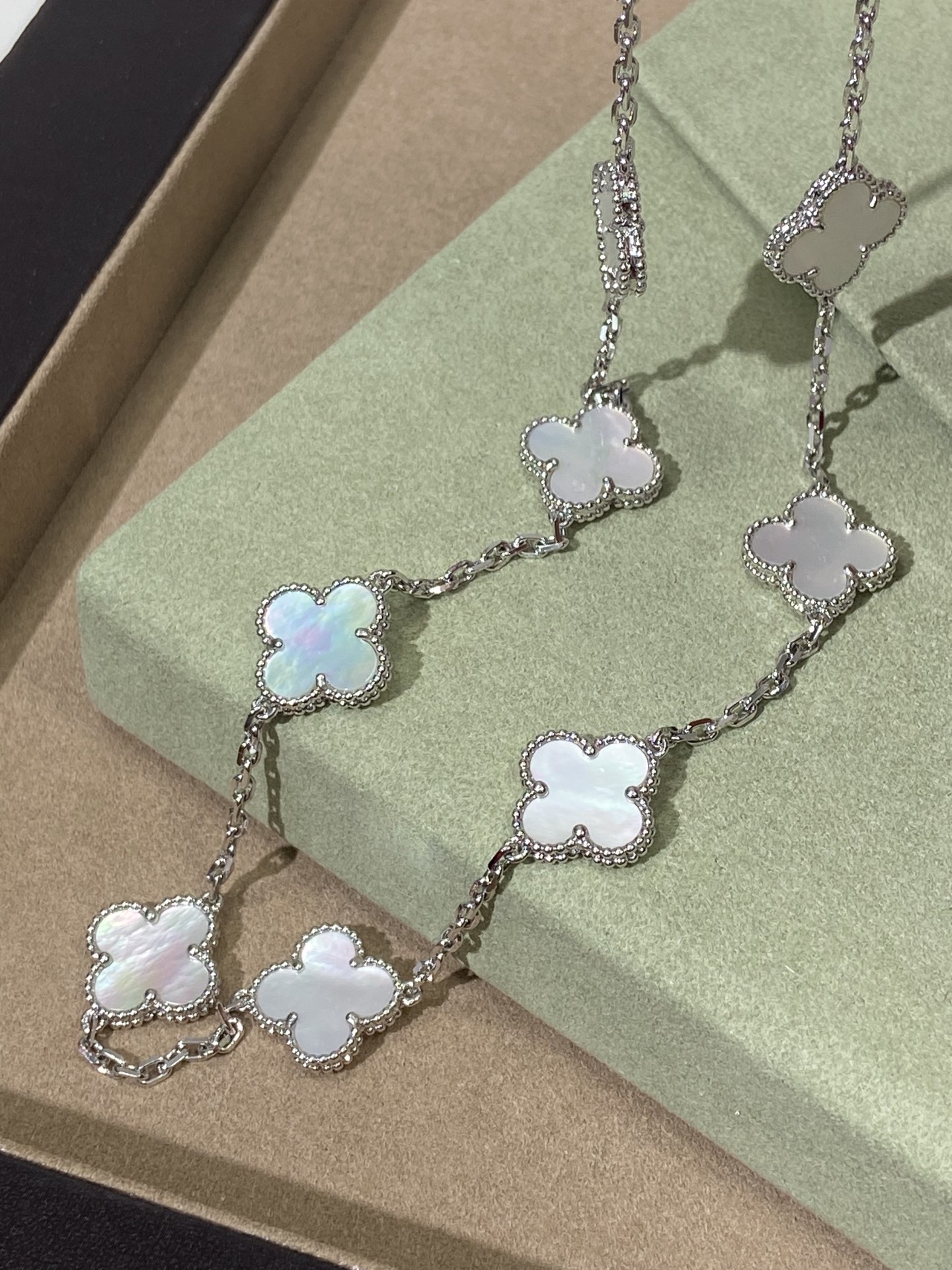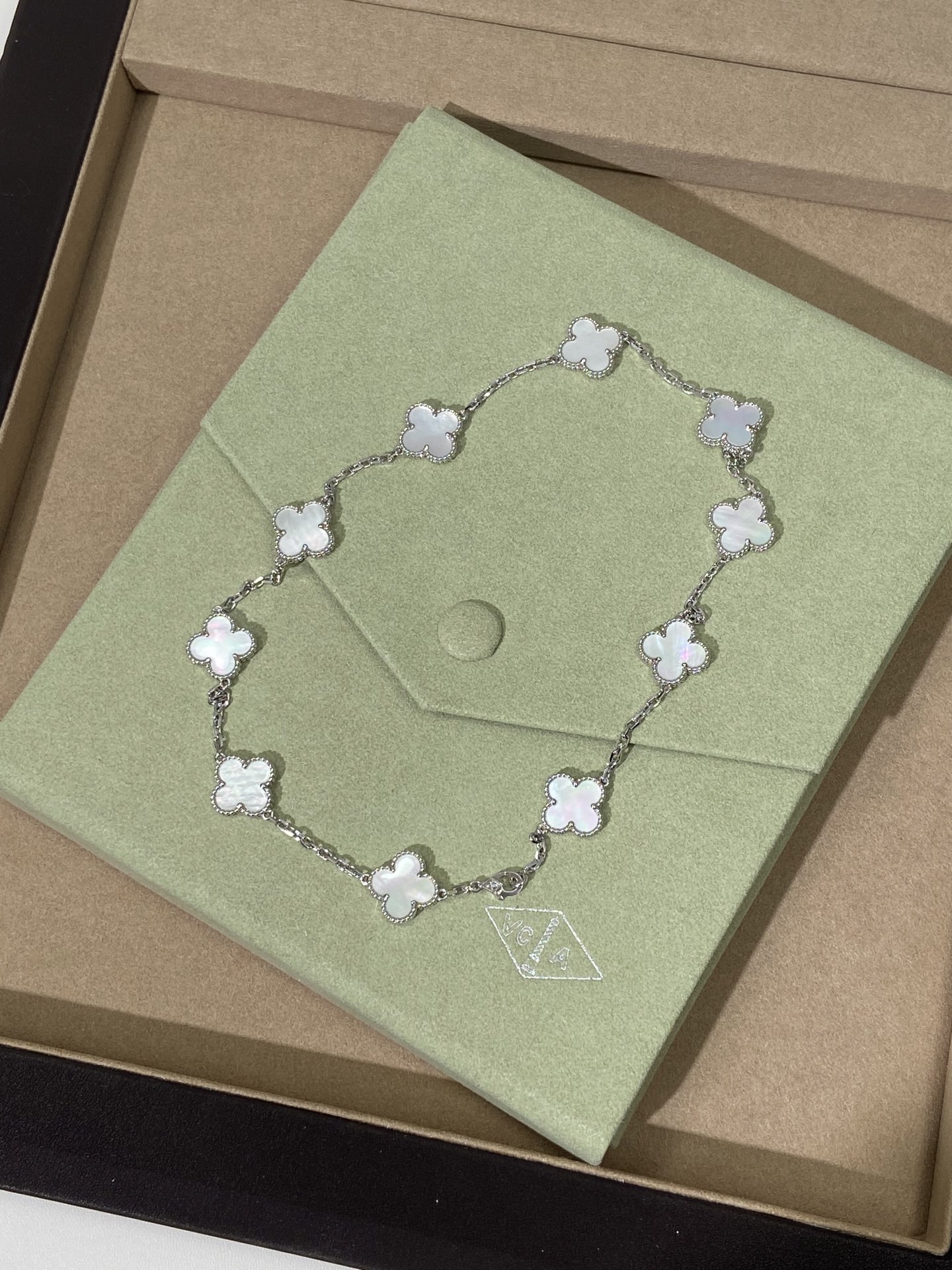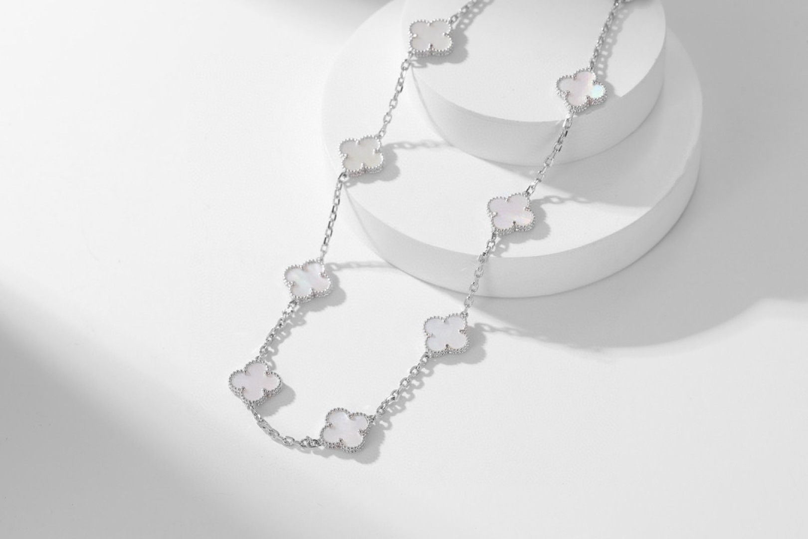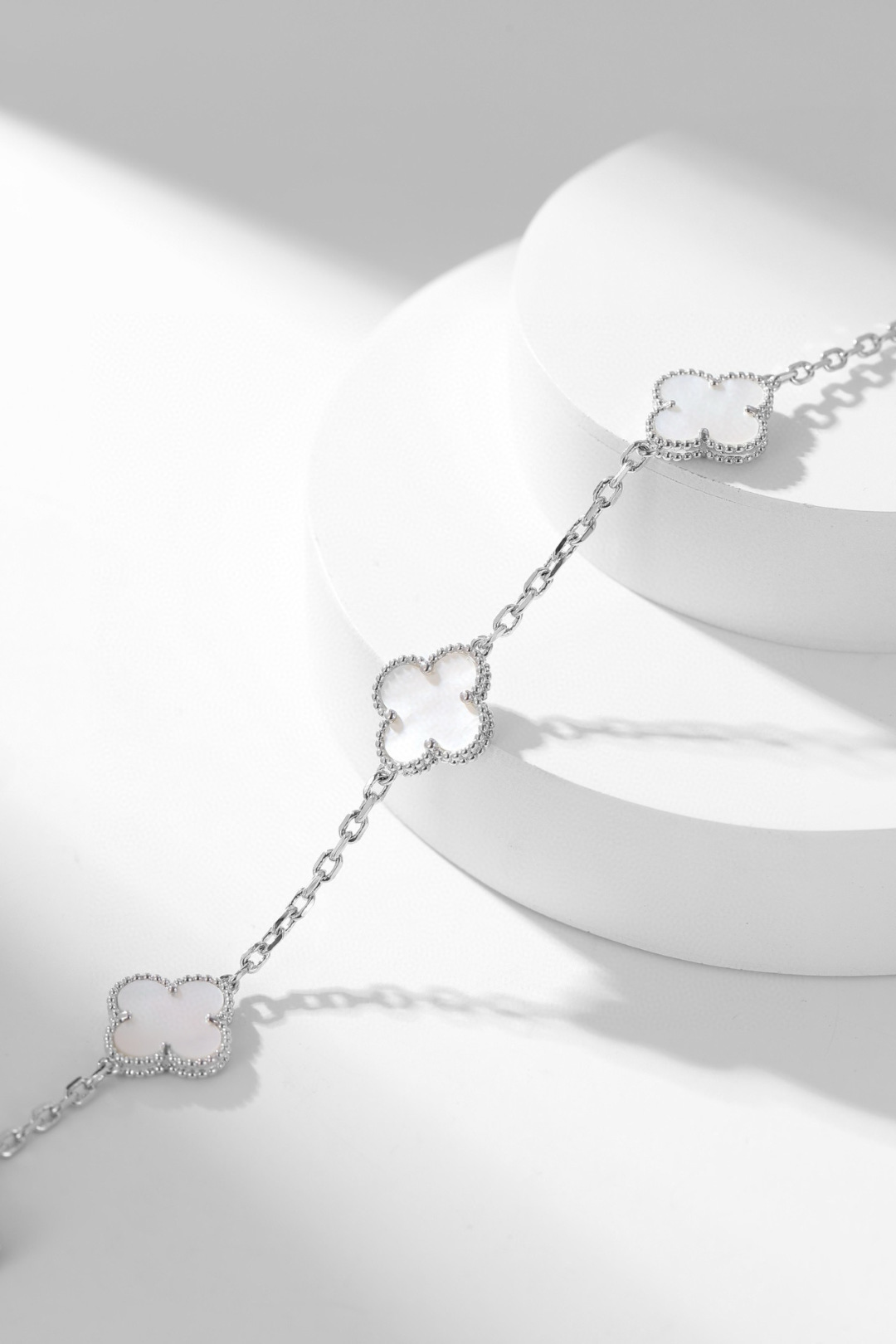 DÂY CHUYỀN VAN CLEEF & ARPELS PEARLS NGỌC TRAI TRẮNG.May mắn nở rộ, một dải ngân hà trên cổ tay bạn—dây chuyền cỏ bốn lá mười hoa đang là món đồ cực kỳ thịnh hành hiện nay. Chiếc dây chuyền cỏ bốn lá mười hoa này không chỉ là một món trang sức, mà còn là biểu tượng của sự may mắn và một lời chúc tốt đẹp. Dù trong những dịp quan trọng hay cuộc sống thường ngày, nó đều có thể tô điểm thêm vẻ quyến rũ độc đáo cho bạn. Hãy tự thưởng cho mình để đền đáp những nỗ lực đã bỏ ra; tặng nó cho người thân yêu để truyền tải tình yêu và lời chúc phúc. Hãy để may mắn này nở rộ mãi mãi trên cổ tay bạn. Và màu kim loại độc đáo, khác biệt so với các thương hiệu khác, cho phép bạn kết nối với người thân yêu một cách tự nhiên, không chút khó xử. Phiên bản xà cừ trắng: Xà cừ trắng có độ bóng mềm mại, tinh khiết và thanh lịch. Giống như sương mai, nó nhẹ nhàng bao bọc lấy cỏ bốn lá may mắn, mang đến cho bạn một khí chất tươi mới và tinh tế, thể hiện sự dịu dàng và năng động.