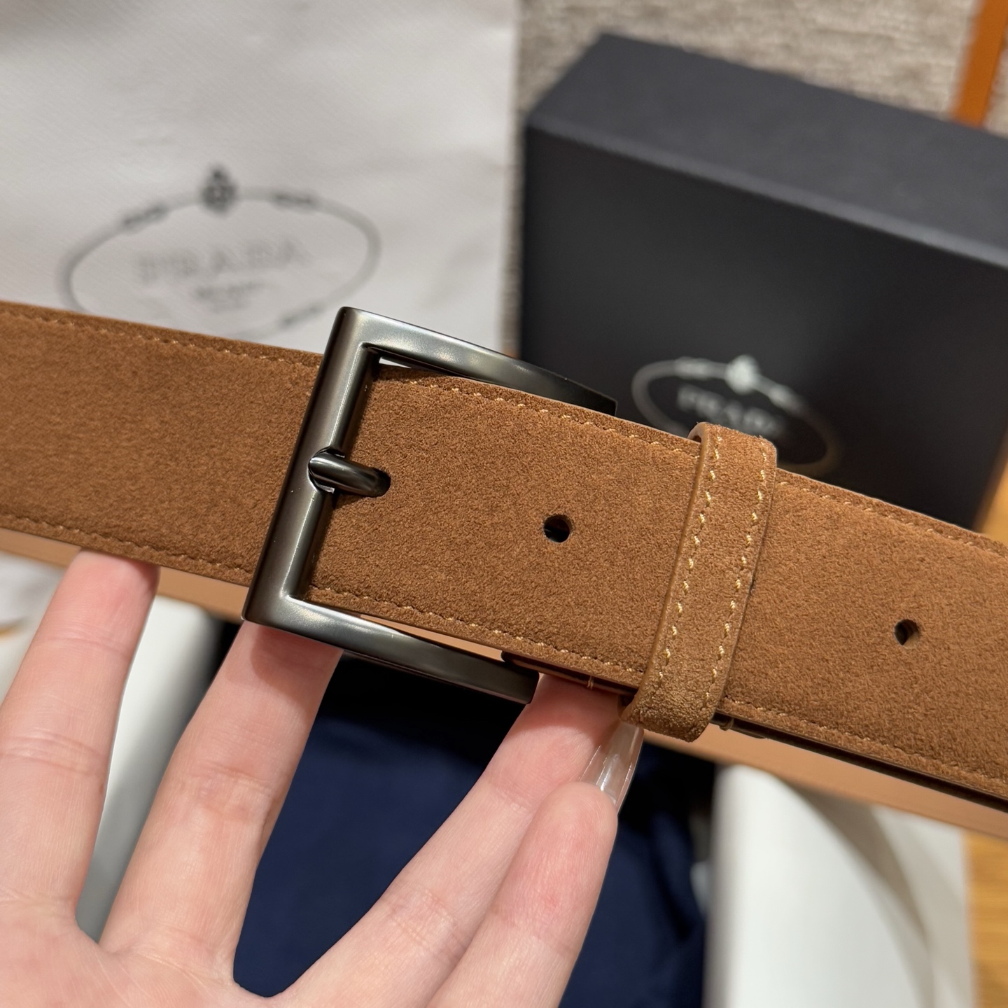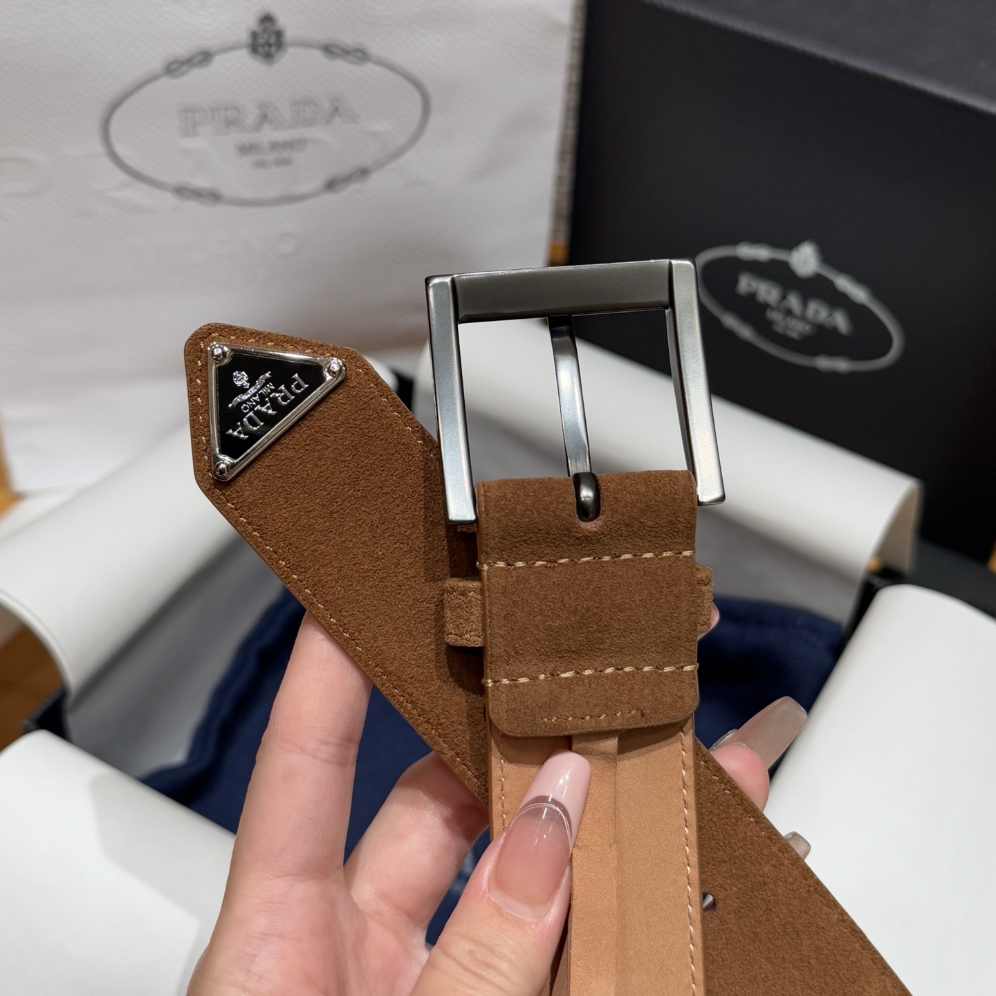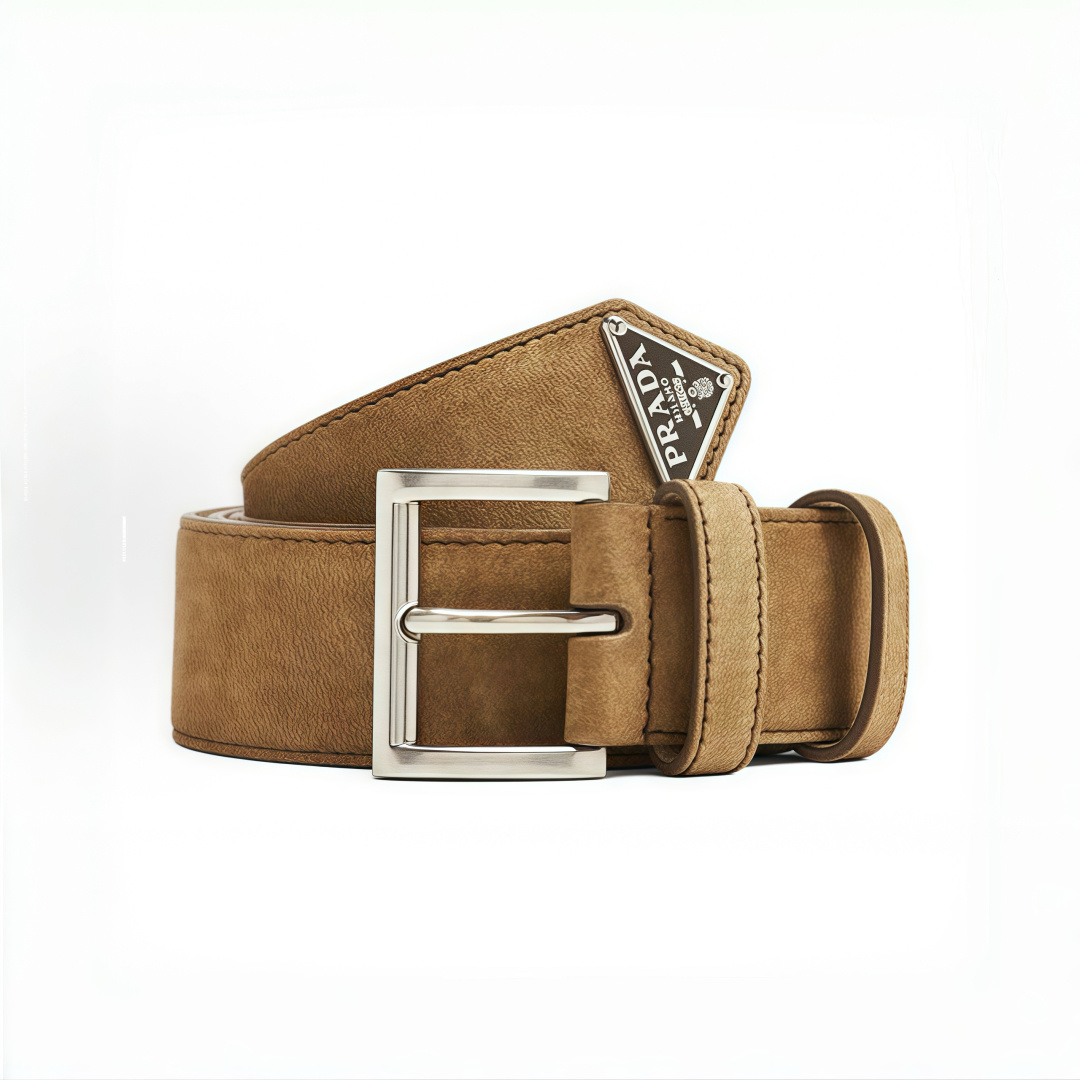 PRADA 🇮🇹 Thắt lưng da lộn nam Prada. Chiếc thắt lưng da bò lộn này có kiểu dáng tối giản nhưng tinh tế, với biểu tượng kim loại hình tam giác tráng men nổi bật ở phần cuối. Chiều rộng: 3,5cm (phiên bản cao cấp).