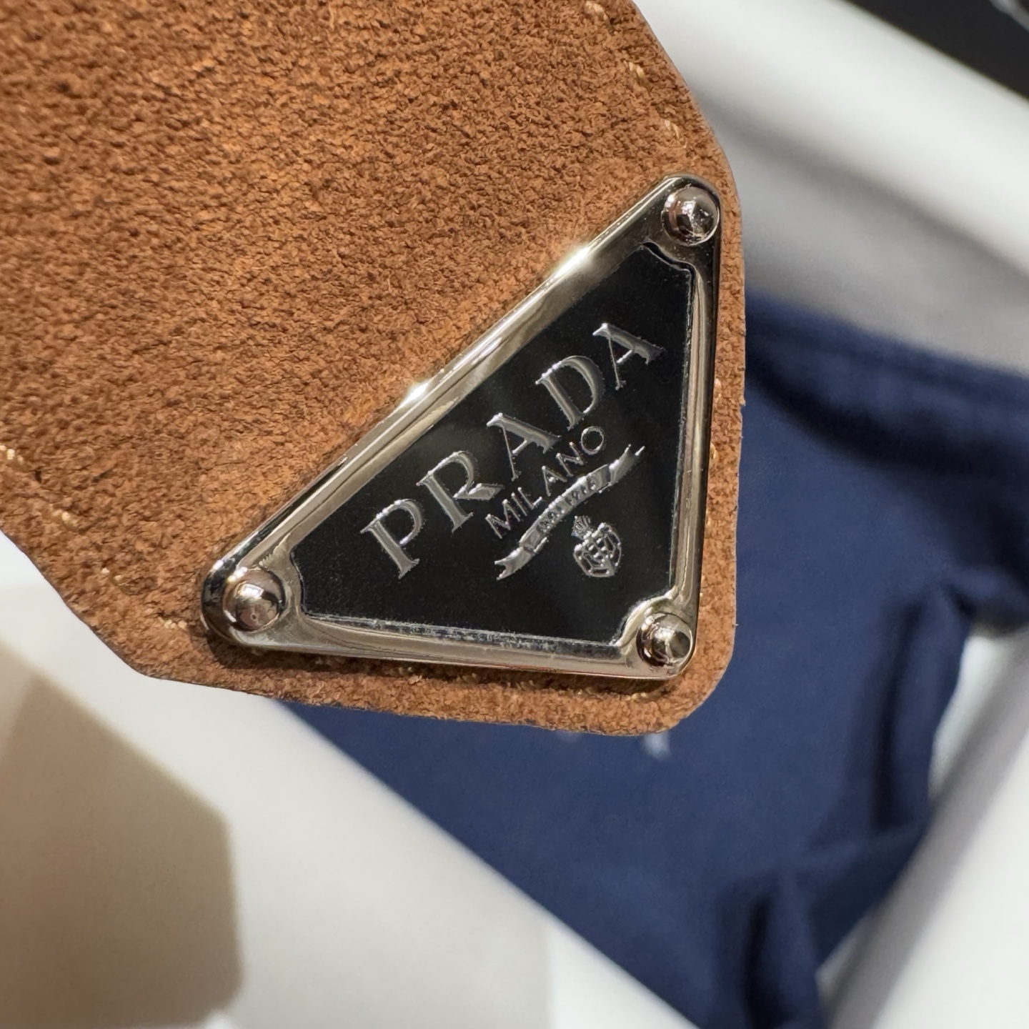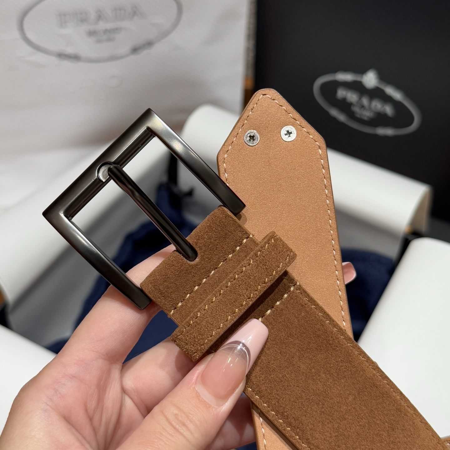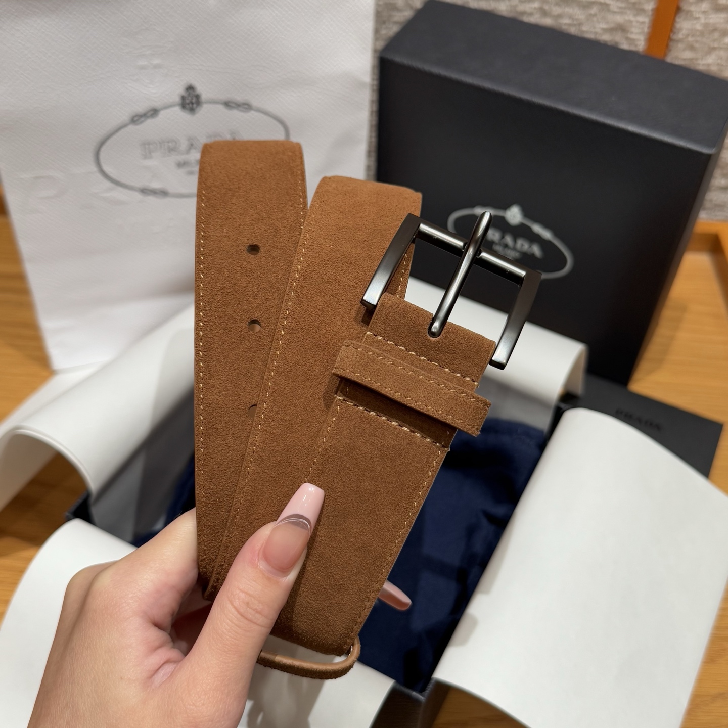 PRADA 🇮🇹 Thắt lưng da lộn nam Prada. Chiếc thắt lưng da bò lộn này có kiểu dáng tối giản nhưng tinh tế, với biểu tượng kim loại hình tam giác tráng men nổi bật ở phần cuối. Chiều rộng: 3,5cm (phiên bản cao cấp).