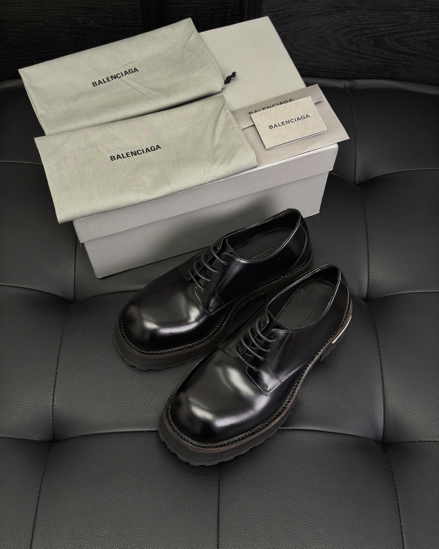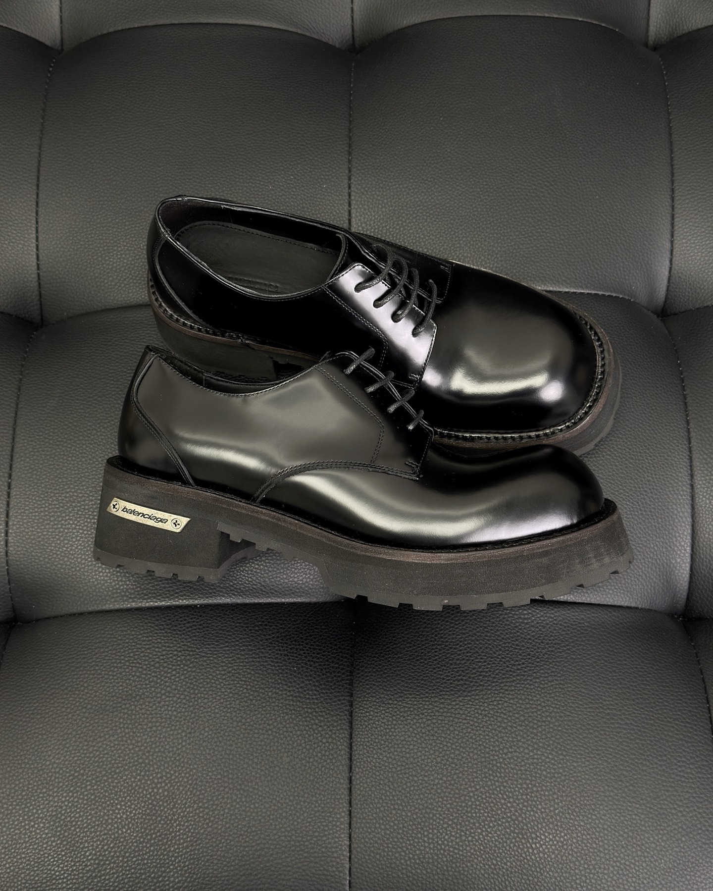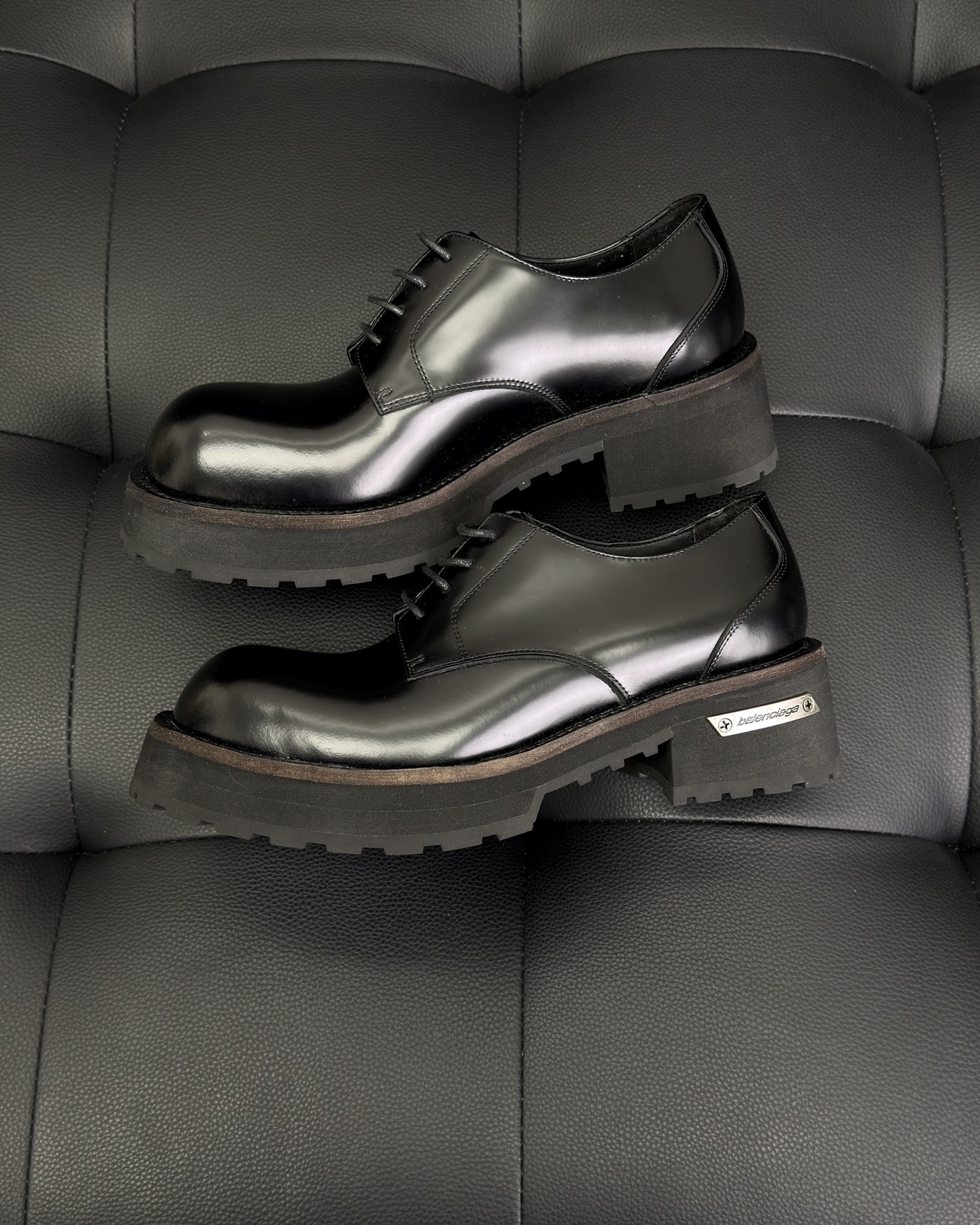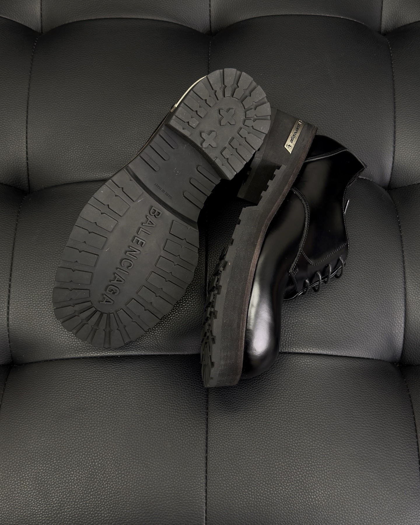 Giày Derby nam Balenciaga VENOM. Mũi giày tròn lớn 20mm với 4 lỗ xỏ dây và kiểu buộc dây. Mặt ngoài đế giày được trang trí bằng một tấm bảng tên cổ điển khắc logo Balenciaga. Đế màu đen. Kích cỡ: 39 40 41 42 43 44 45 46.