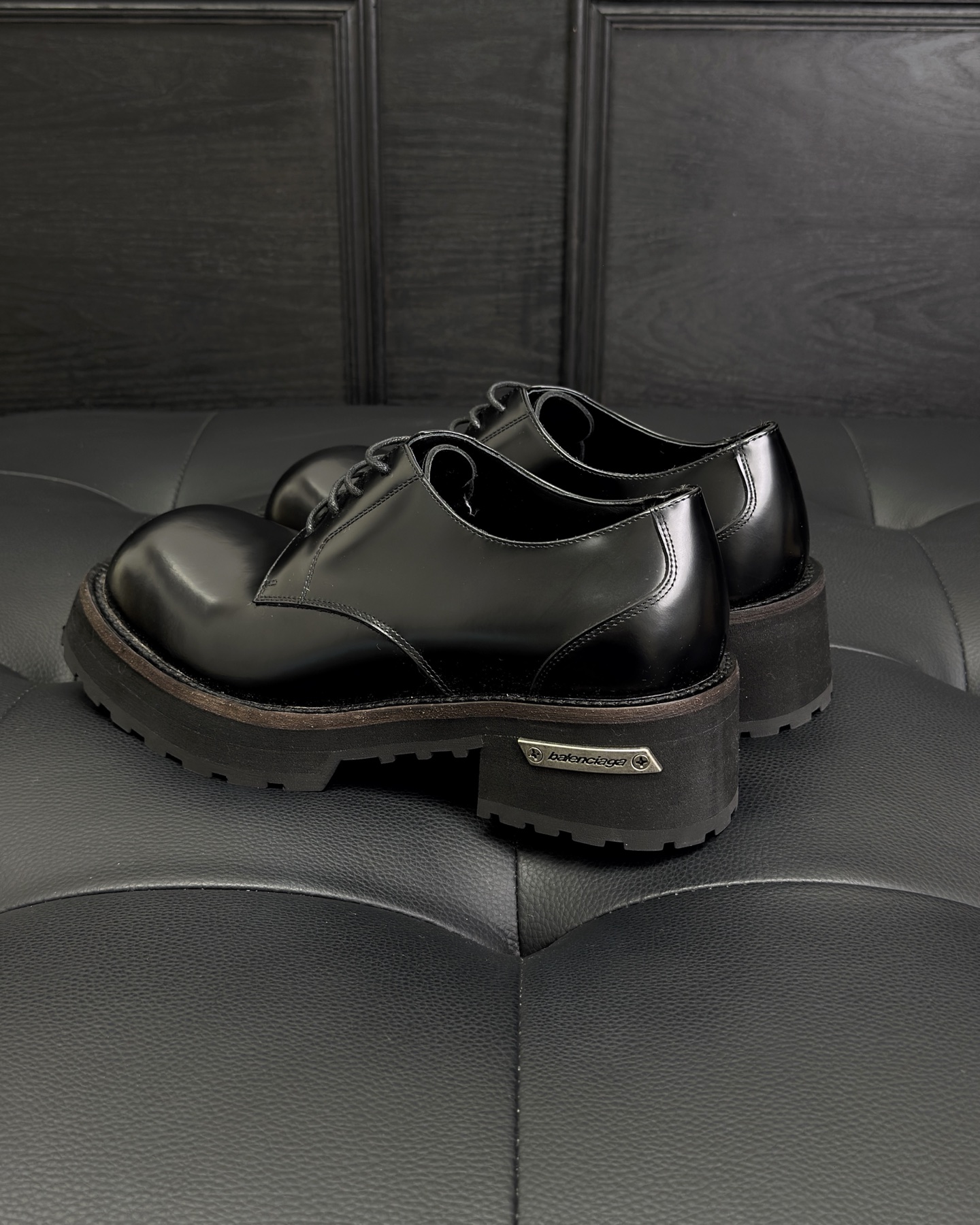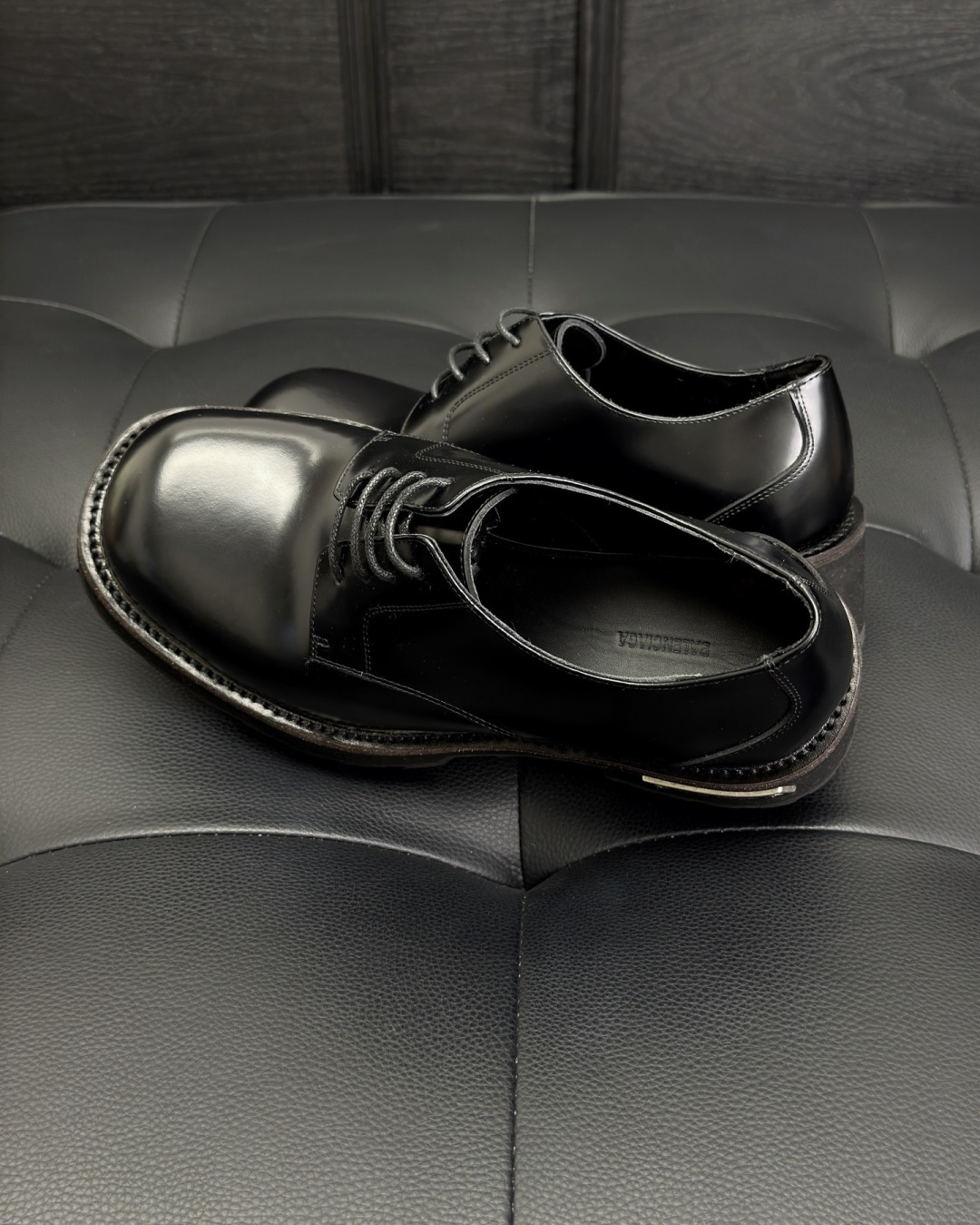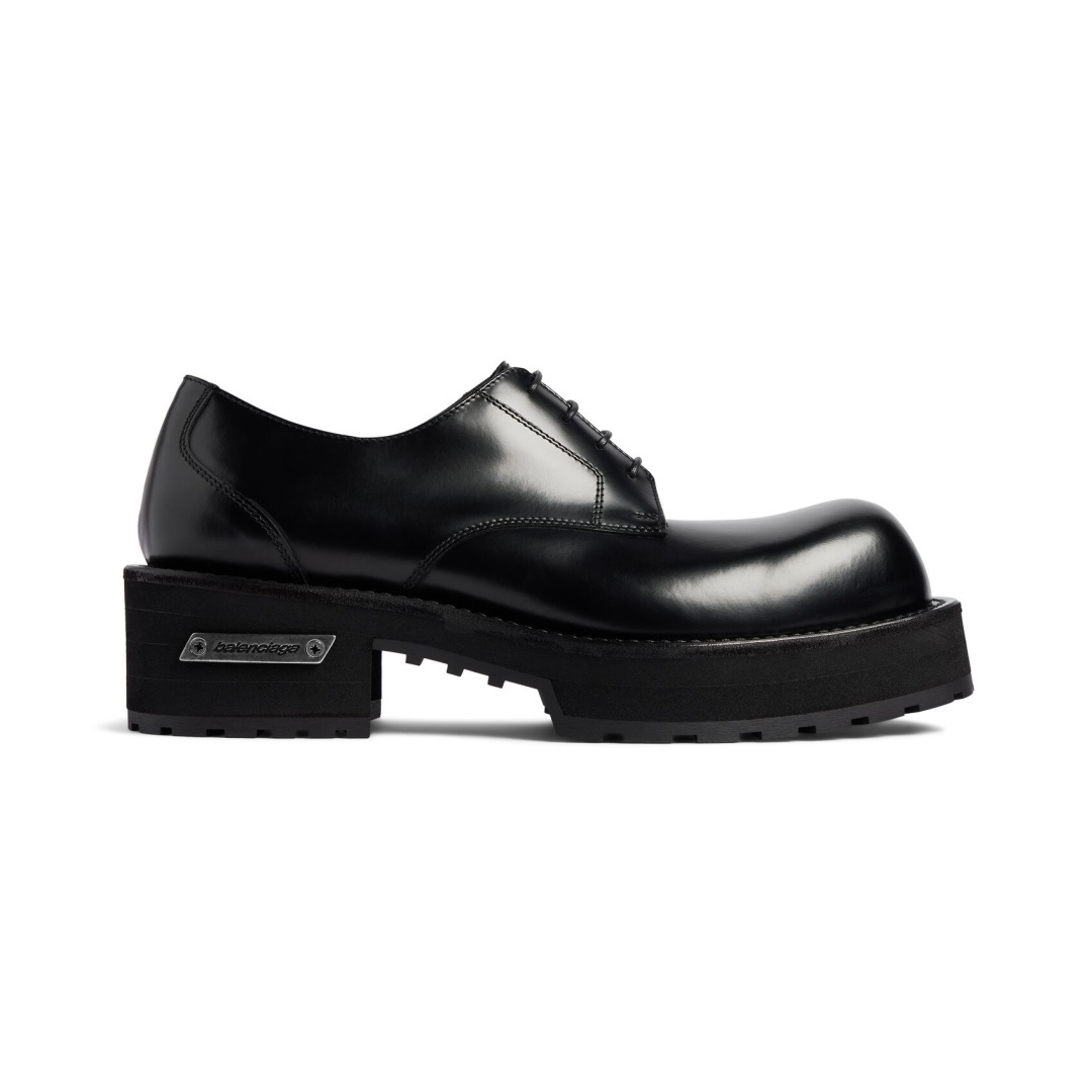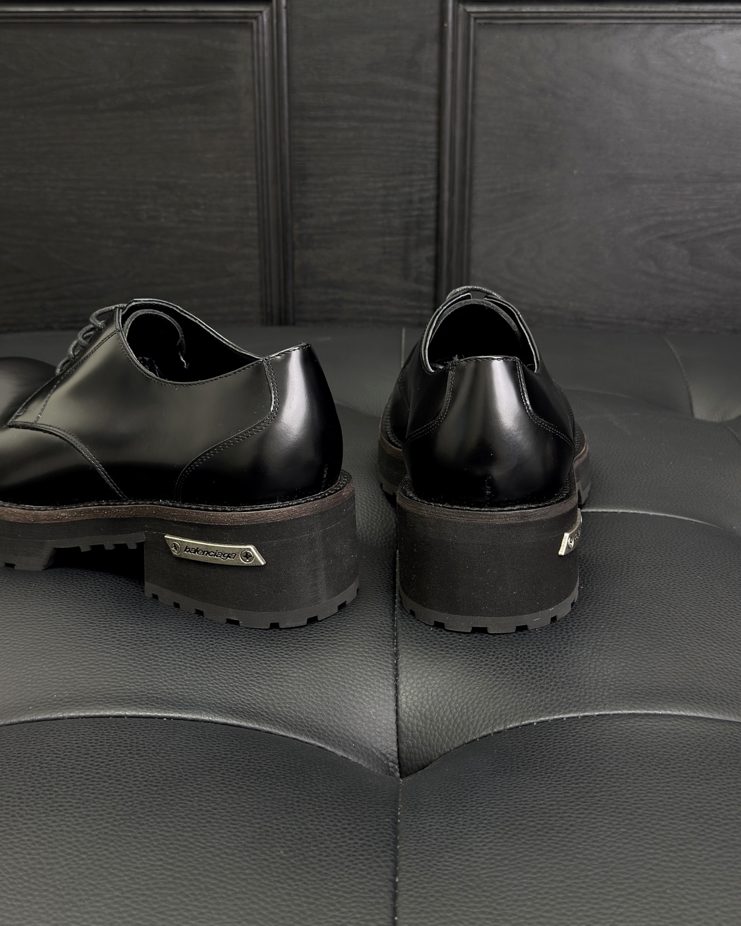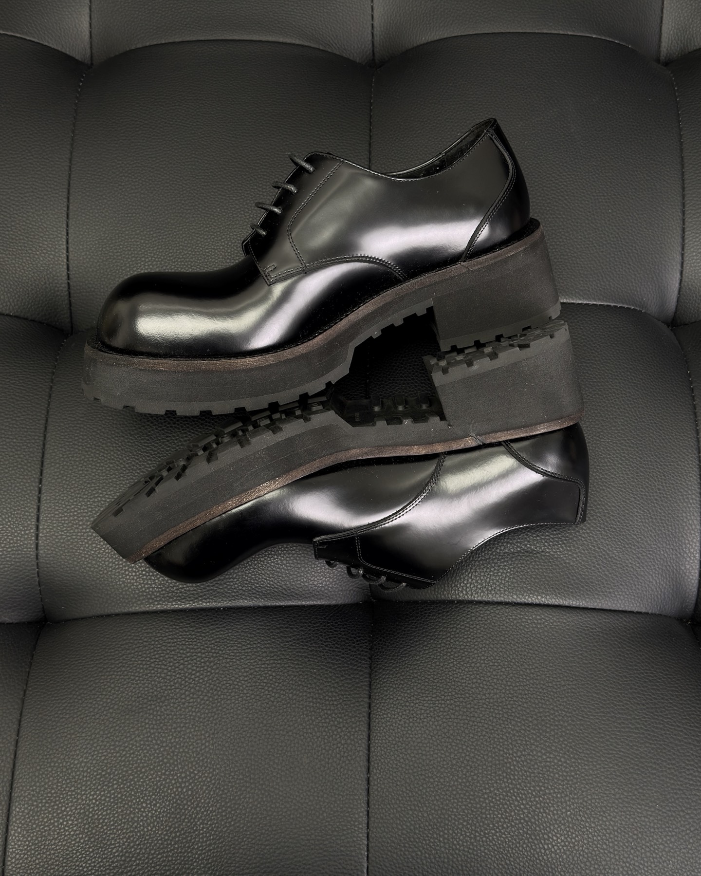 Giày Derby nam Balenciaga VENOM. Mũi giày tròn lớn 20mm với 4 lỗ xỏ dây và kiểu buộc dây. Mặt ngoài đế giày được trang trí bằng một tấm bảng tên cổ điển khắc logo Balenciaga. Đế màu đen. Kích cỡ: 39 40 41 42 43 44 45 46.