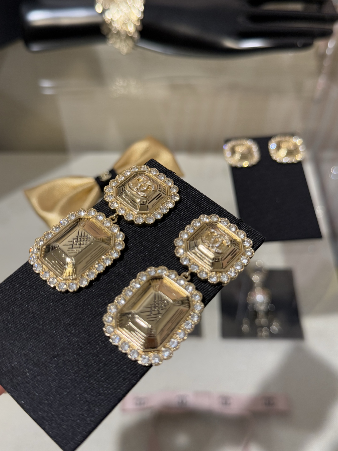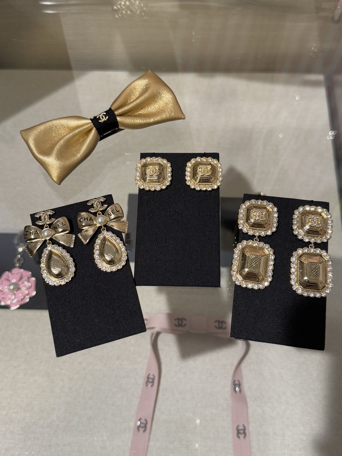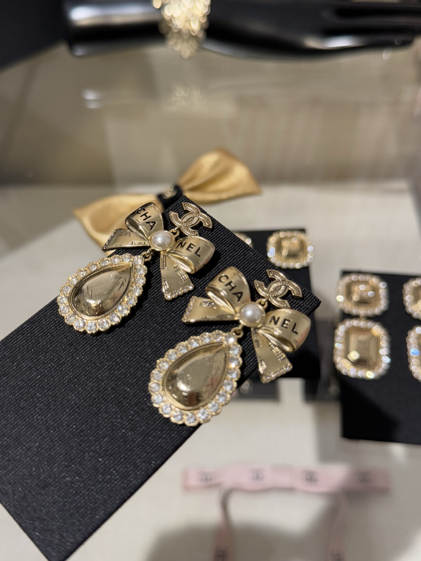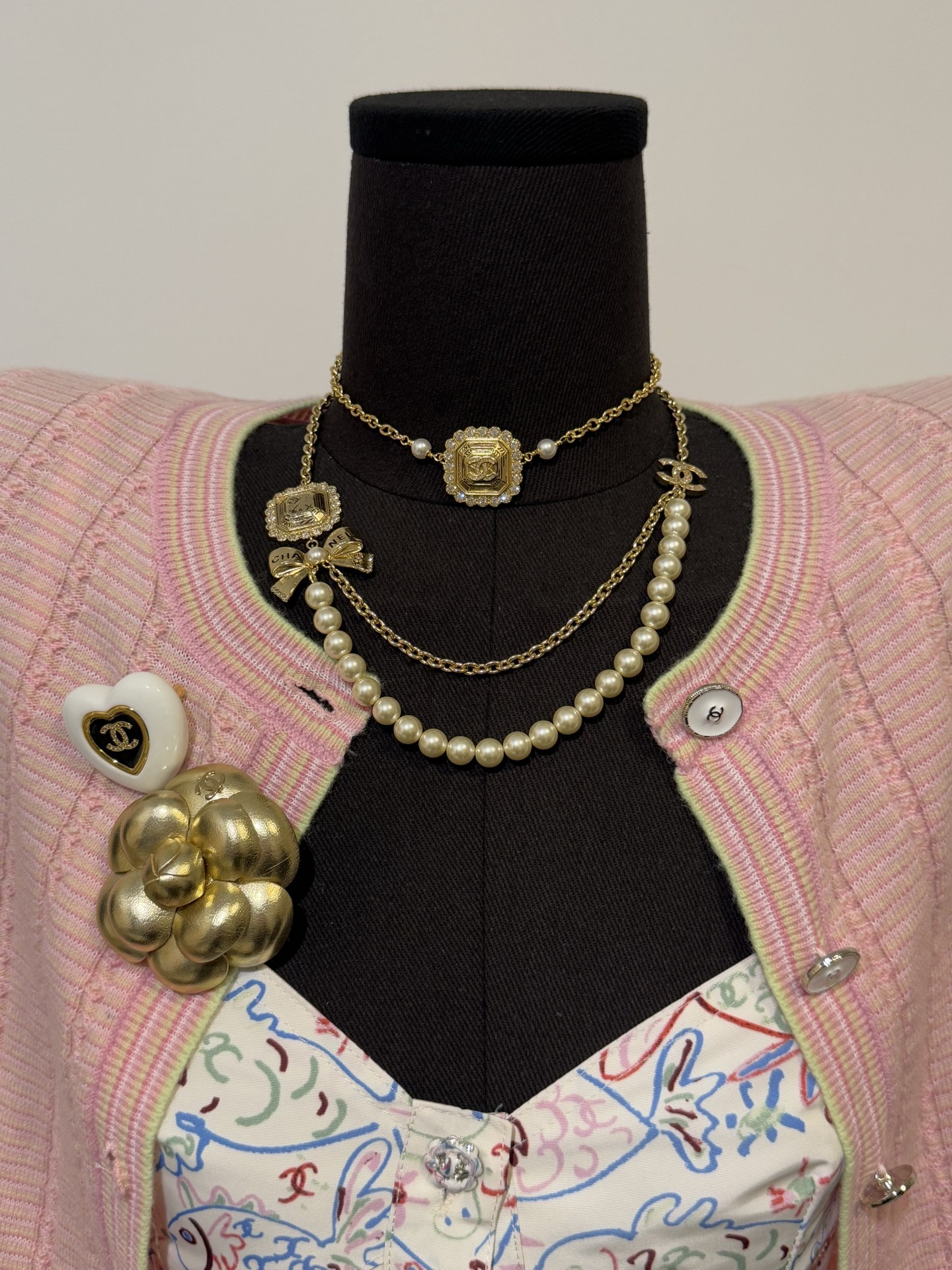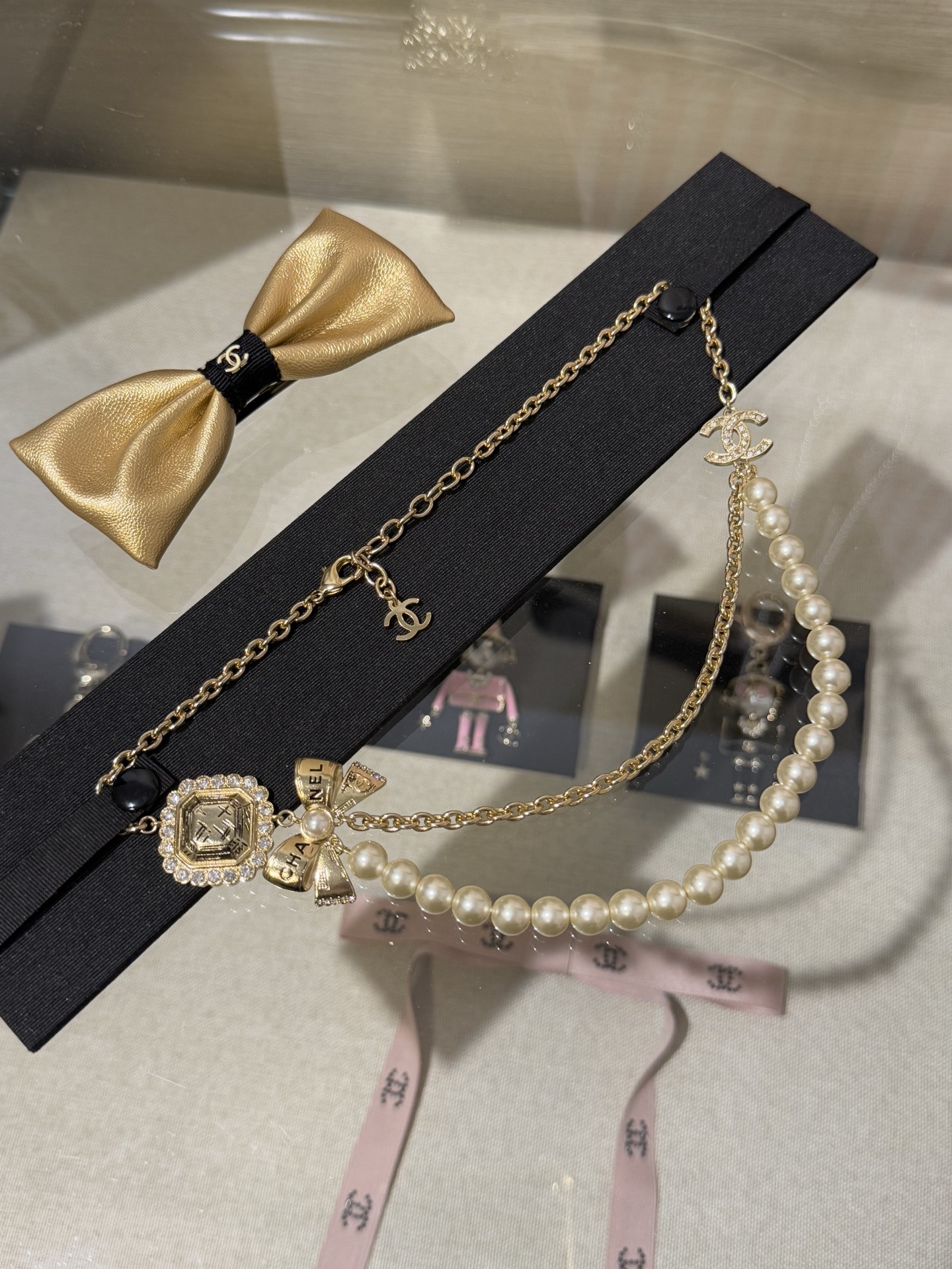Phụ kiện Chanel mạ vàng 25K, mặt dây chuyền hình vuông đính chữ C kép, nơ và họa tiết ren chạm khắc, pha lê và ngọc trai. Ấn phẩm này, mang đậm tính thẩm mỹ hoài cổ, nghiêng về phong cách vintage. Mỗi sản phẩm đều được trang bị bộ lọc cao cấp, toát lên vẻ tinh tế và sang trọng.