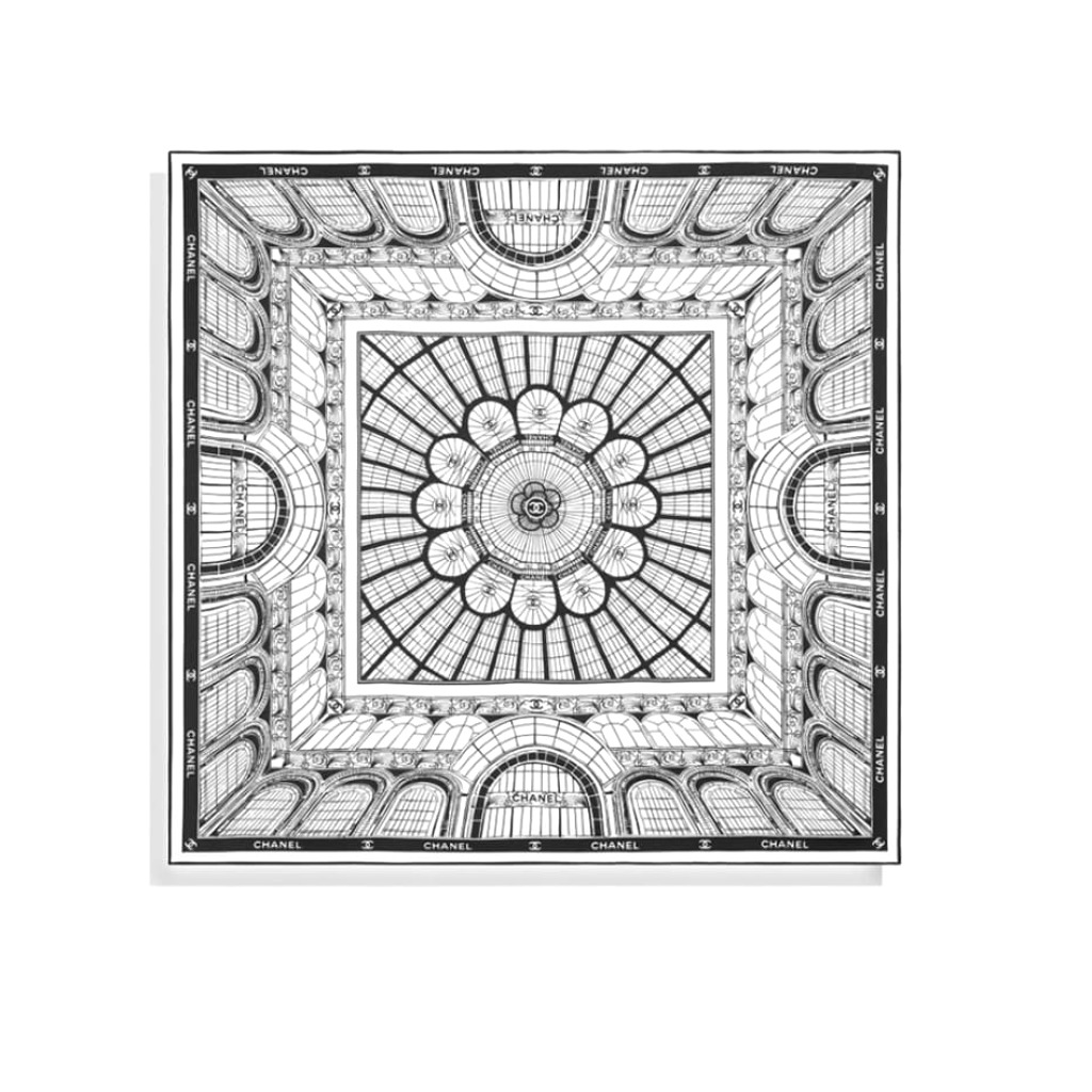 Khăn vuông lụa hình chim cung điện 25S Grand Palace Những bức tranh đen trắng tái hiện nghệ thuật mái vòm của buổi trình diễn, và phần trên bằng lụa chéo nhẹ được buộc hờ hững để tạo nên bầu không khí mang phong cách Pháp. Sự kết hợp khéo léo giữa lồng chim tự do và logo chữ C kép ngụ ý một suy nghĩ triết lý sâu sắc về tự do và sự kiềm chế.