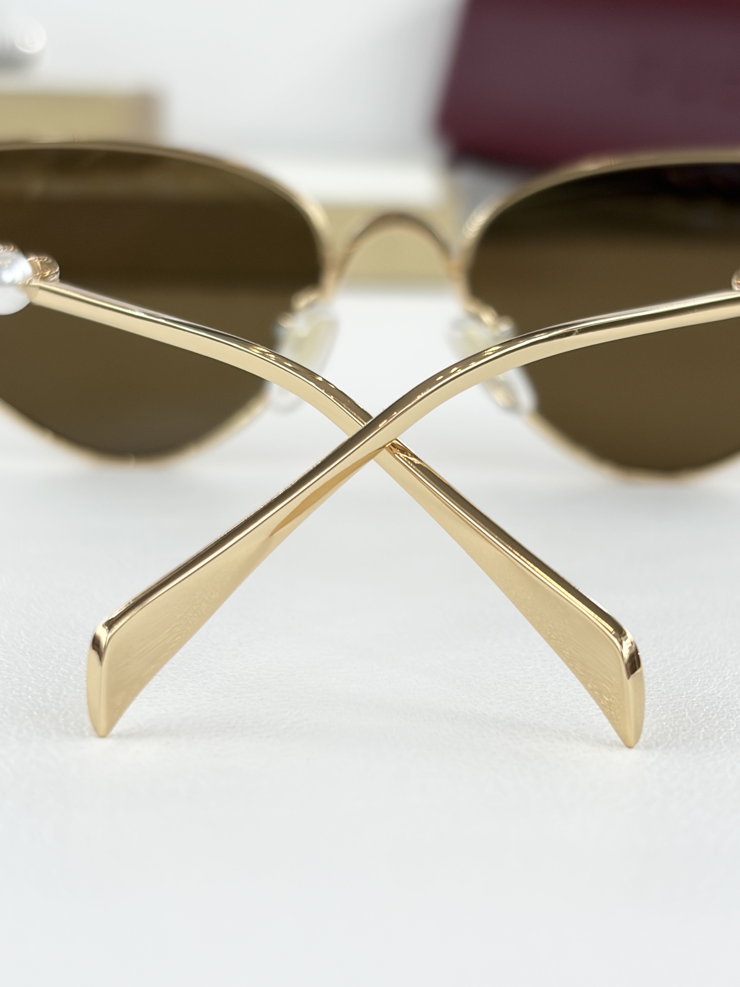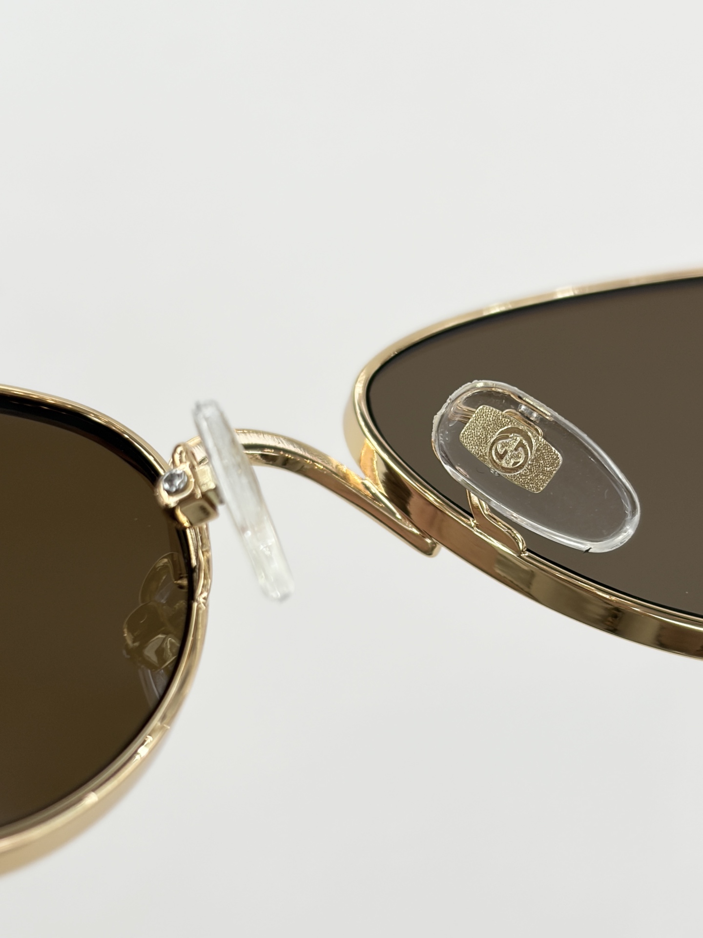 Kiểu gọng lớn đơn giản và ấn tượng, logo kim loại màu vàng ở cả hai bên gọng kính cùng logo chữ cái làm nổi bật phong cách độc đáo của thương hiệu, mặt trên gọn gàng và thời trang