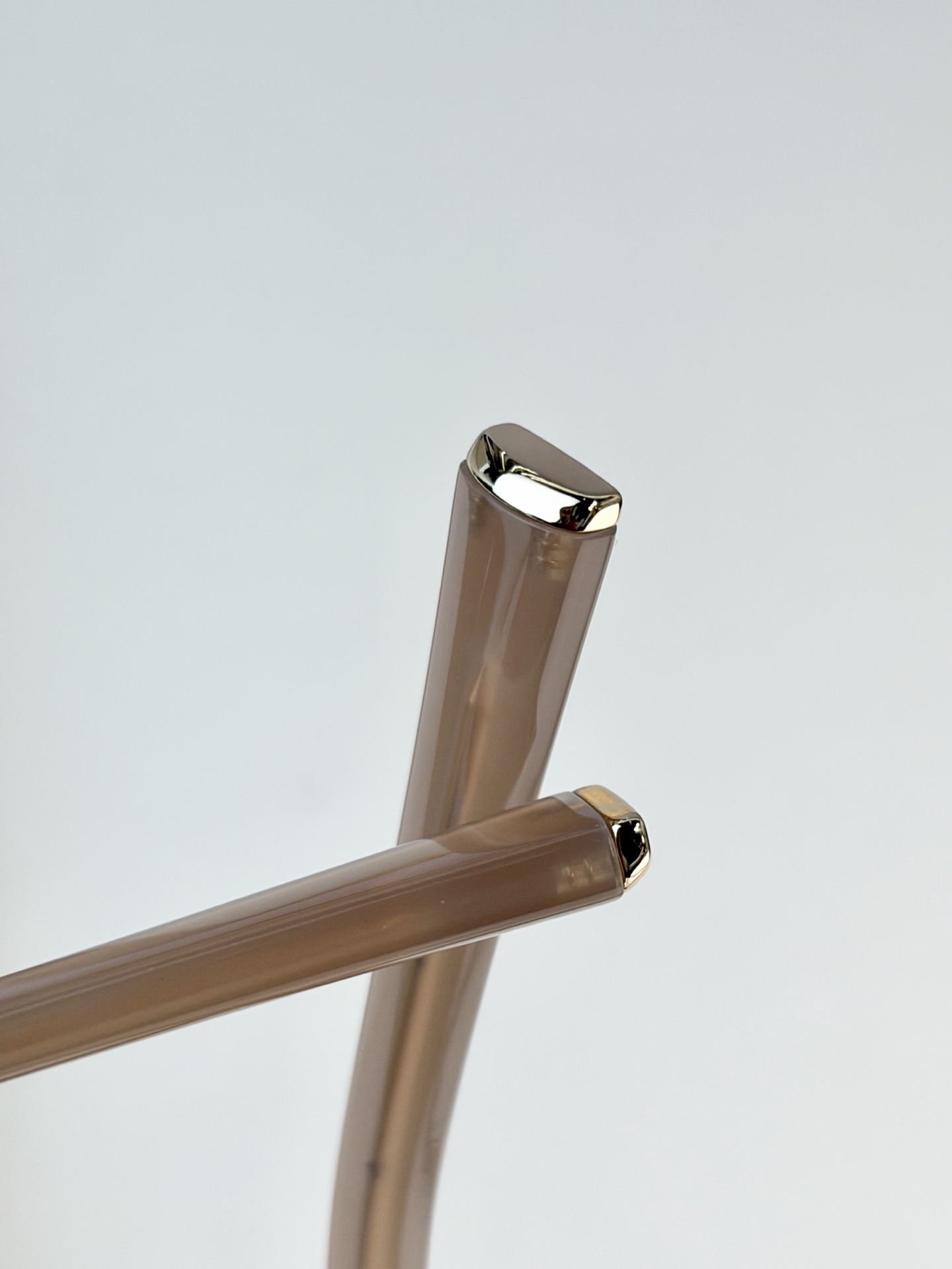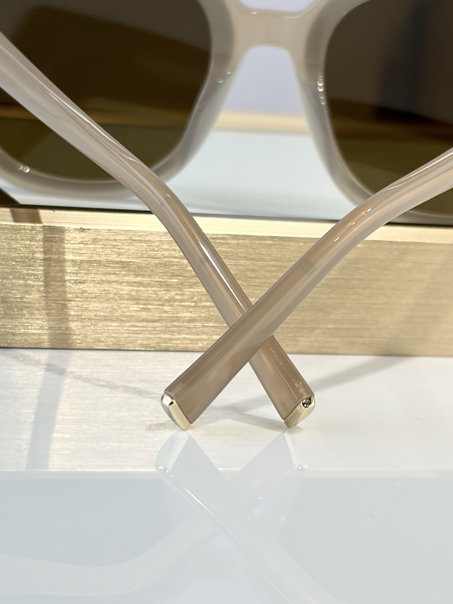 Kiểu gọng lớn đơn giản và ấn tượng, logo kim loại màu vàng ở cả hai bên gọng kính cùng logo chữ cái làm nổi bật phong cách độc đáo của thương hiệu, mặt trên gọn gàng và thời trang