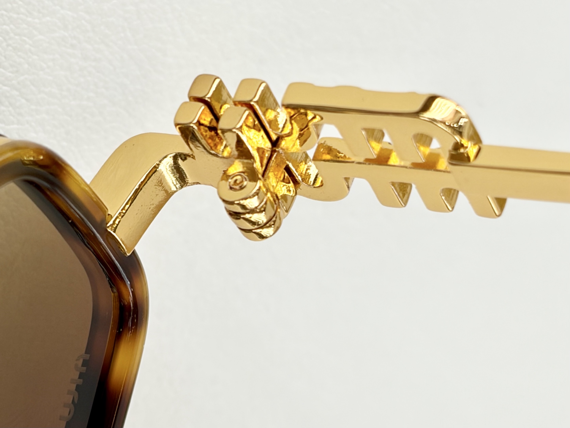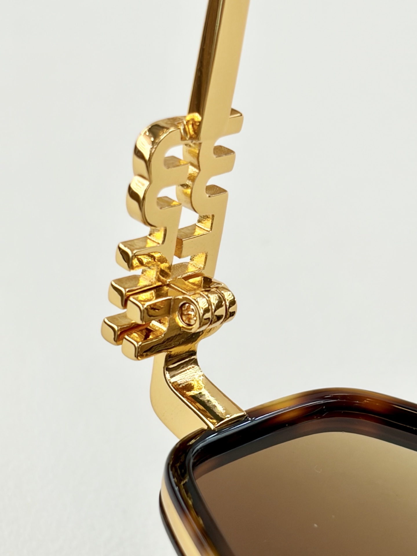 Kiểu gọng lớn đơn giản và ấn tượng, logo kim loại màu vàng ở cả hai bên gọng kính cùng logo chữ cái làm nổi bật phong cách độc đáo của thương hiệu, mặt trên gọn gàng và thời trang