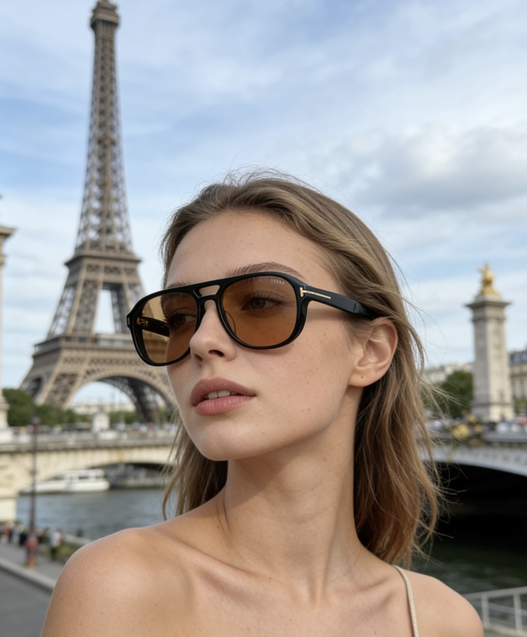 Kiểu gọng lớn đơn giản và ấn tượng, logo kim loại màu vàng ở cả hai bên gọng kính cùng logo chữ cái làm nổi bật phong cách độc đáo của thương hiệu, mặt trên gọn gàng và thời trang
