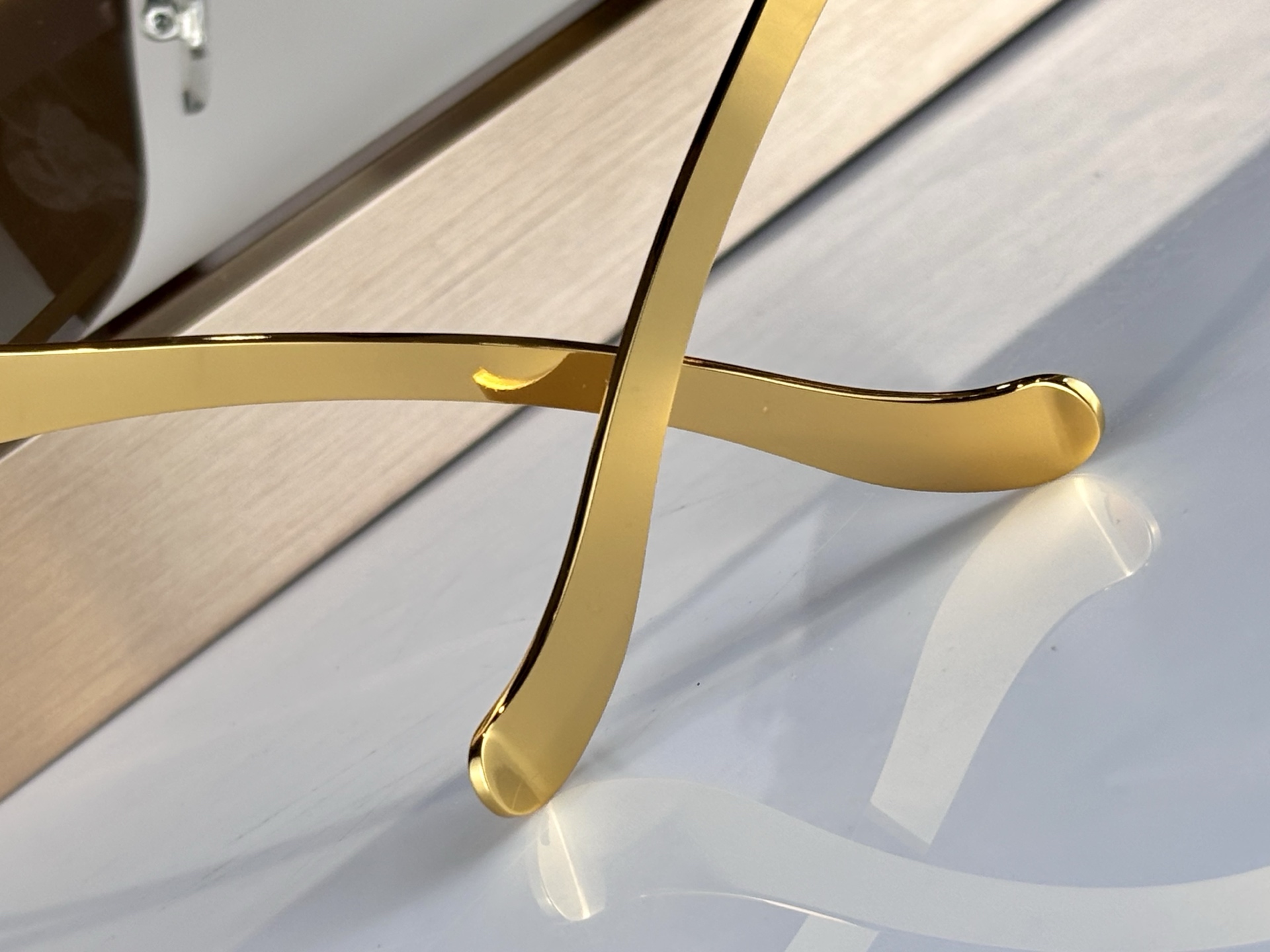 Kiểu gọng lớn đơn giản và ấn tượng, logo kim loại màu vàng ở cả hai bên gọng kính cùng logo chữ cái làm nổi bật phong cách độc đáo của thương hiệu, mặt trên gọn gàng và thời trang