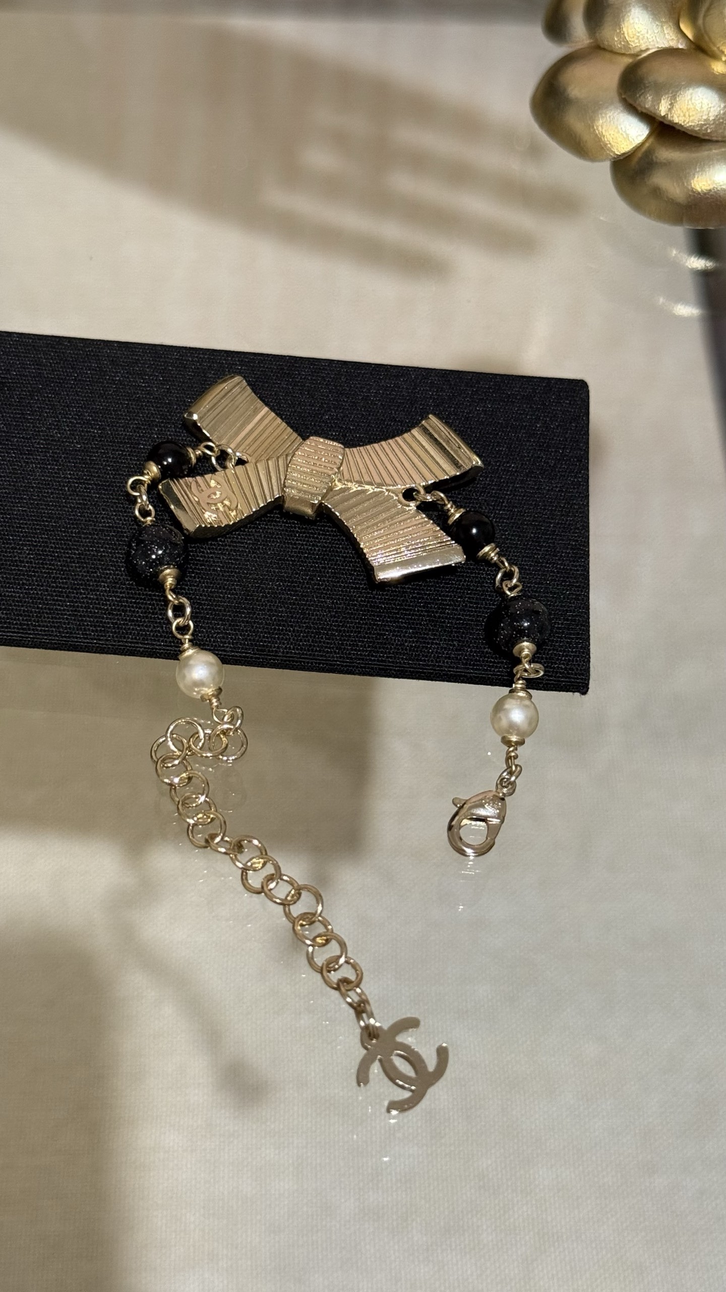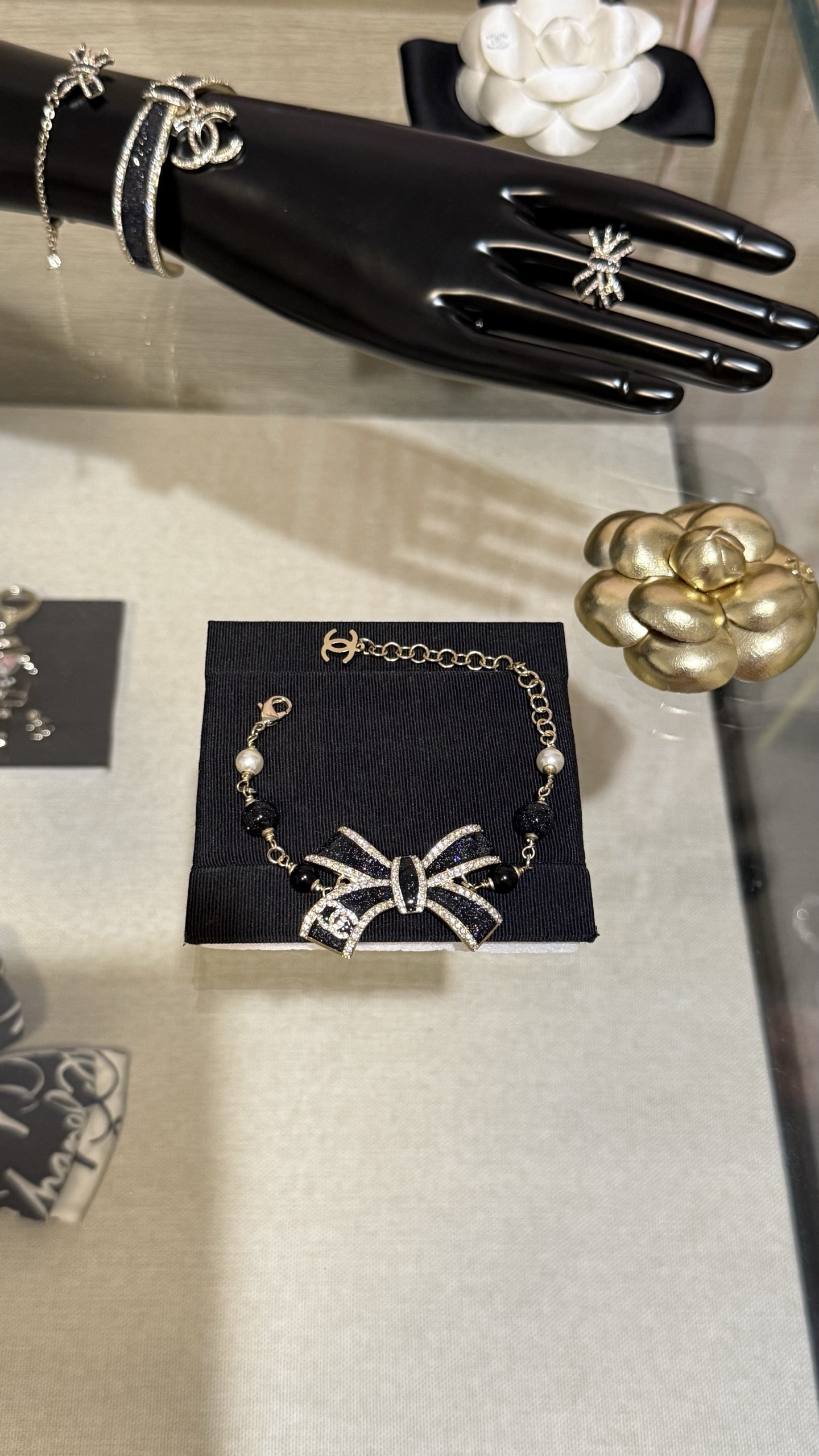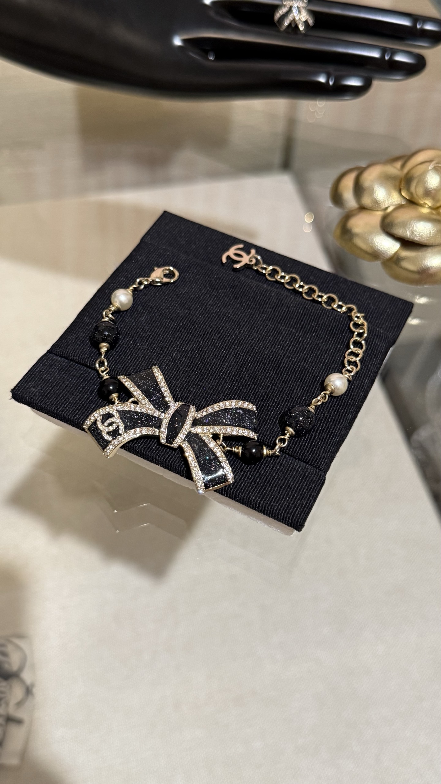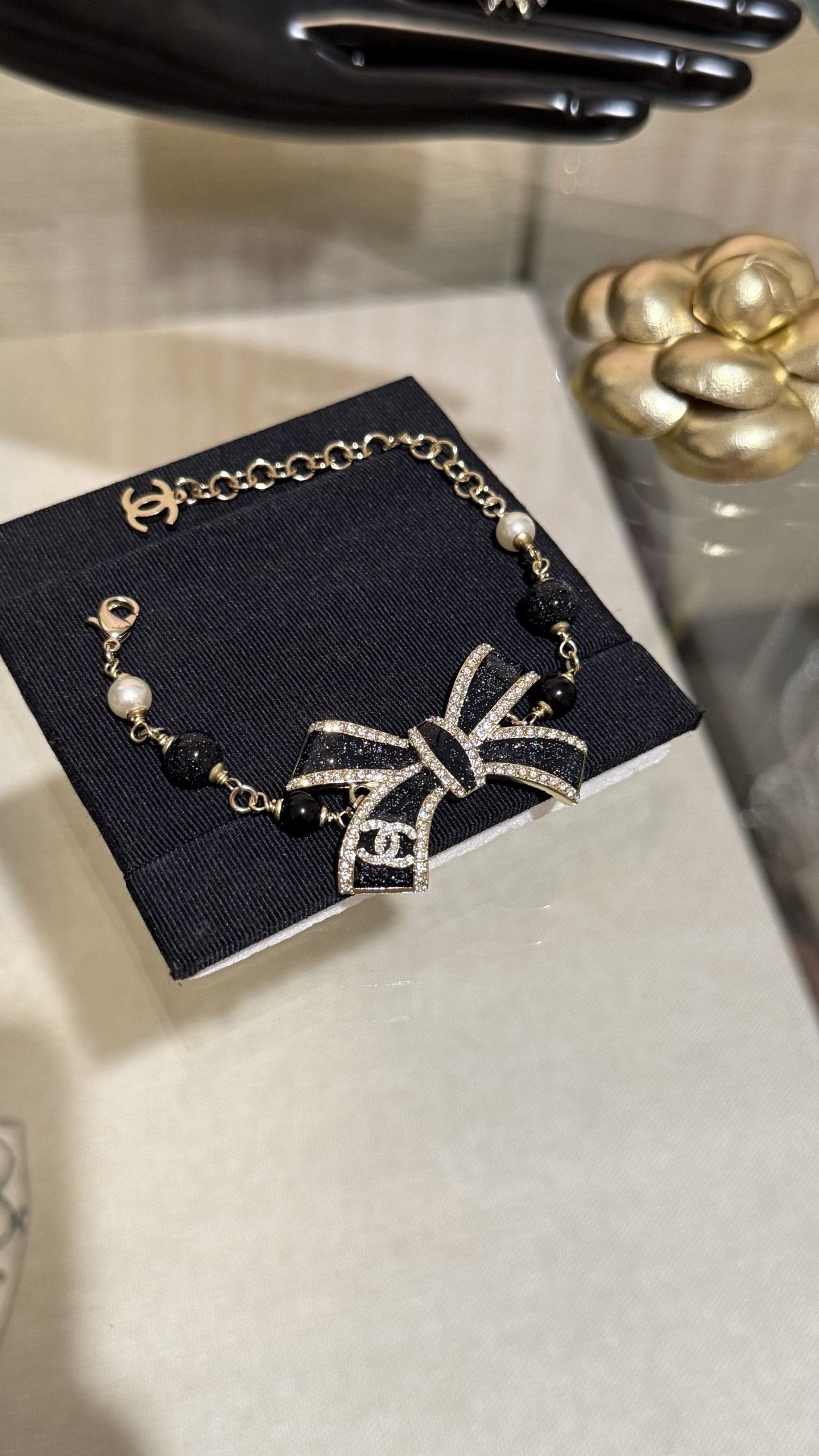 LẮC TAY CHANEL 25B NƠ VÀNG ĐEN ORNAMENT.Vòng tay Chanel 25B nơ vàng đen tráng men, đính kim cương, logo chữ C kép và ngọc trai thủy tinh Nơ vàng đen với những chi tiết lấp lánh tinh tế và được tô điểm bằng ngọc trai thủy tinh, ngọt ngào và thanh lịch, nhưng vẫn toát lên vẻ sang trọng. Phù hợp với trang phục hàng ngày hoặc buổi hẹn hò trà chiều, mang đến cảm giác giàu có và xa hoa.