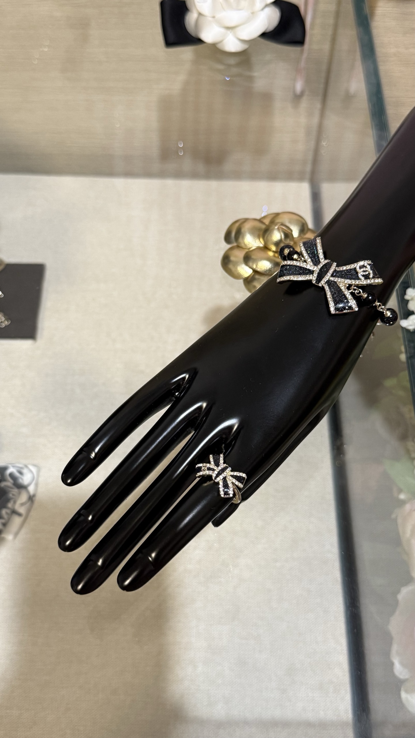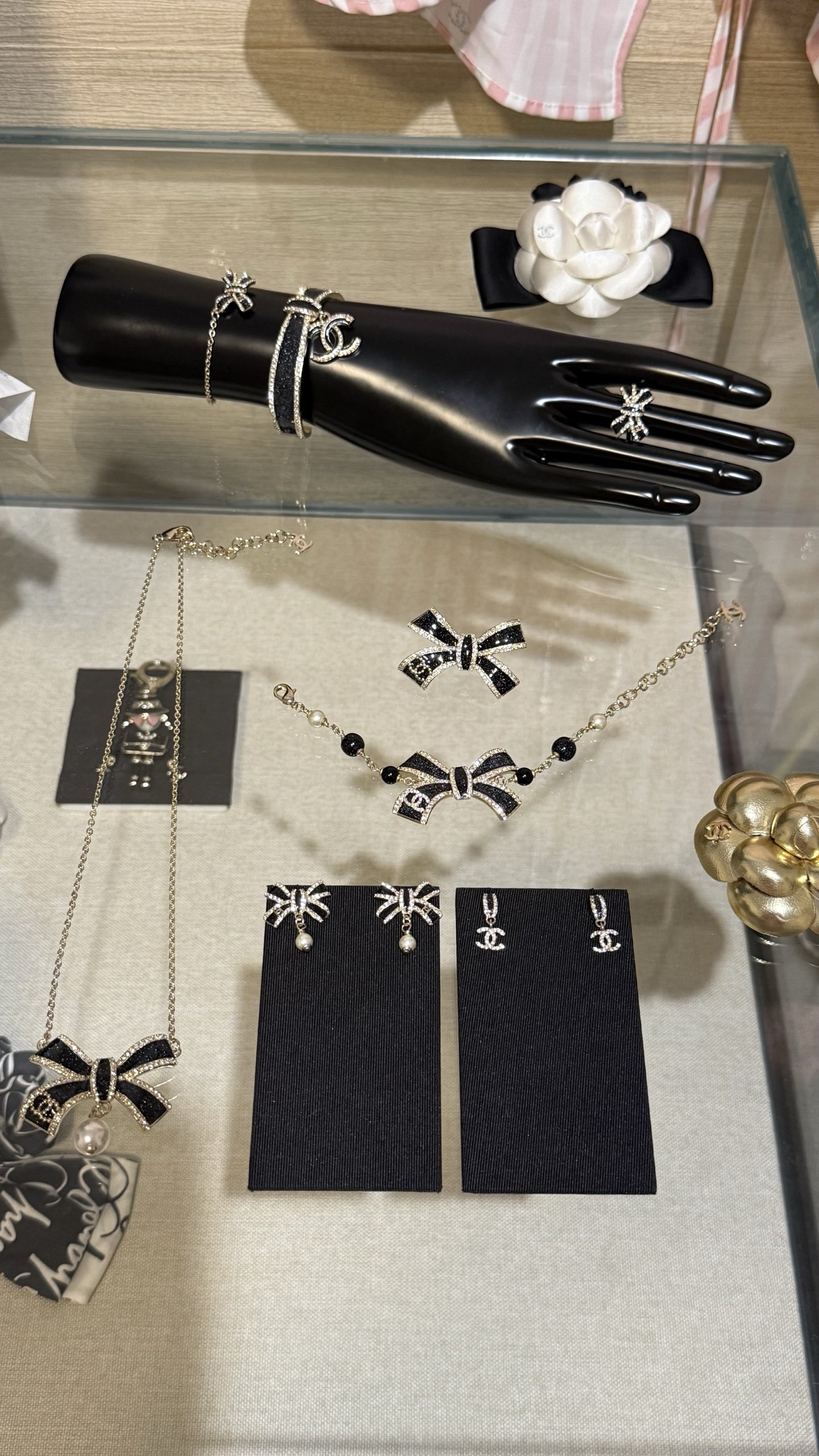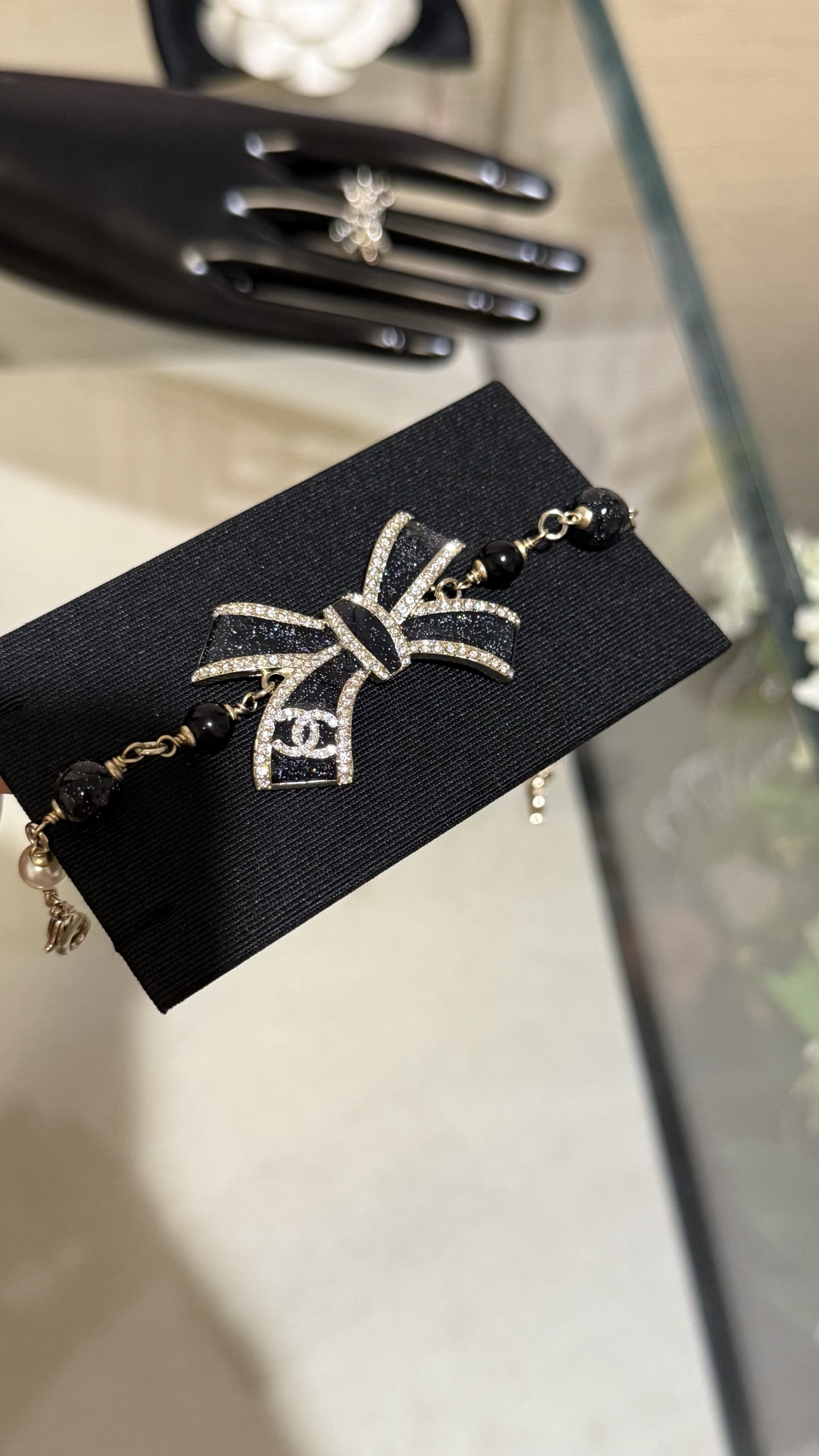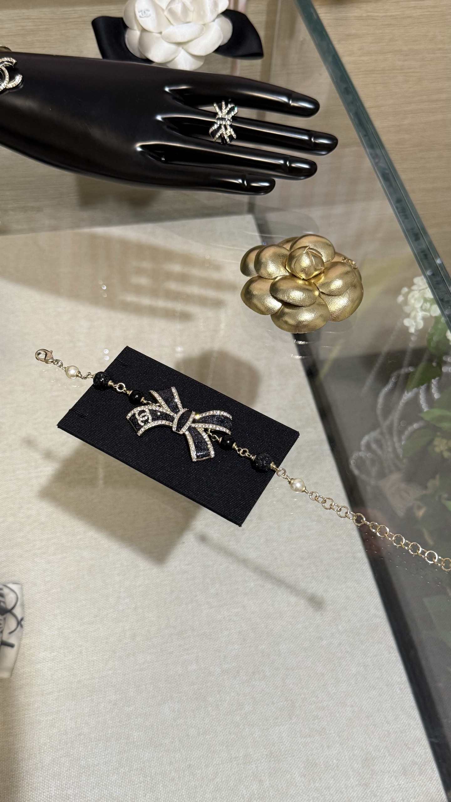 LẮC TAY CHANEL 25B NƠ VÀNG ĐEN ORNAMENT.Vòng tay Chanel 25B nơ vàng đen tráng men, đính kim cương, logo chữ C kép và ngọc trai thủy tinh Nơ vàng đen với những chi tiết lấp lánh tinh tế và được tô điểm bằng ngọc trai thủy tinh, ngọt ngào và thanh lịch, nhưng vẫn toát lên vẻ sang trọng. Phù hợp với trang phục hàng ngày hoặc buổi hẹn hò trà chiều, mang đến cảm giác giàu có và xa hoa.