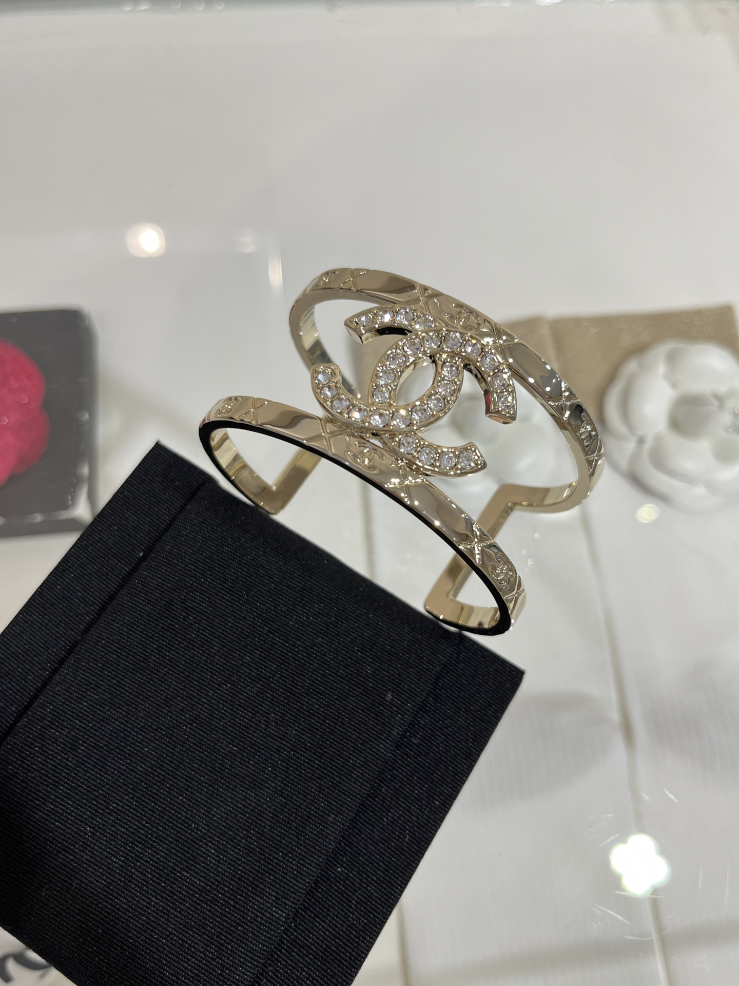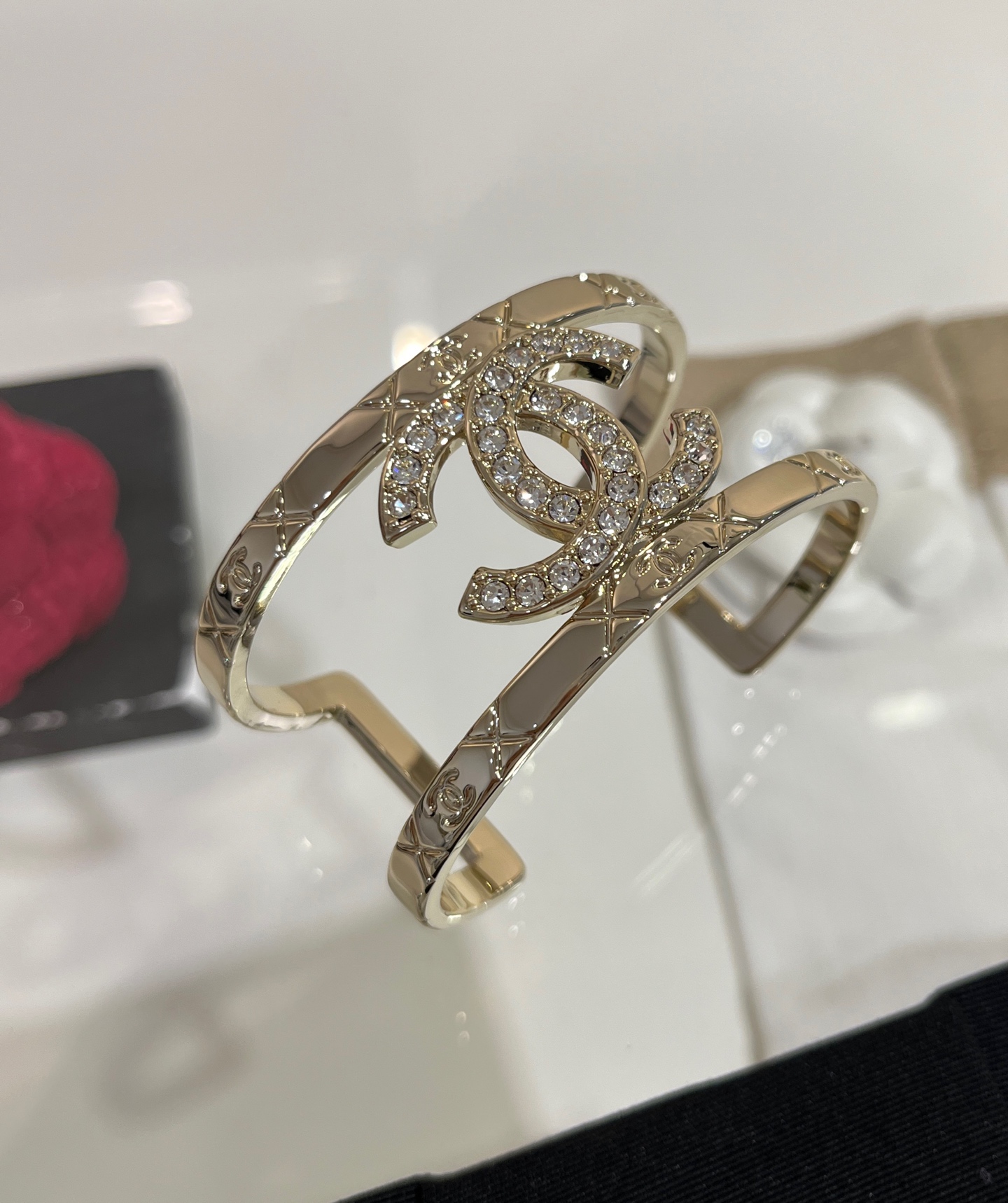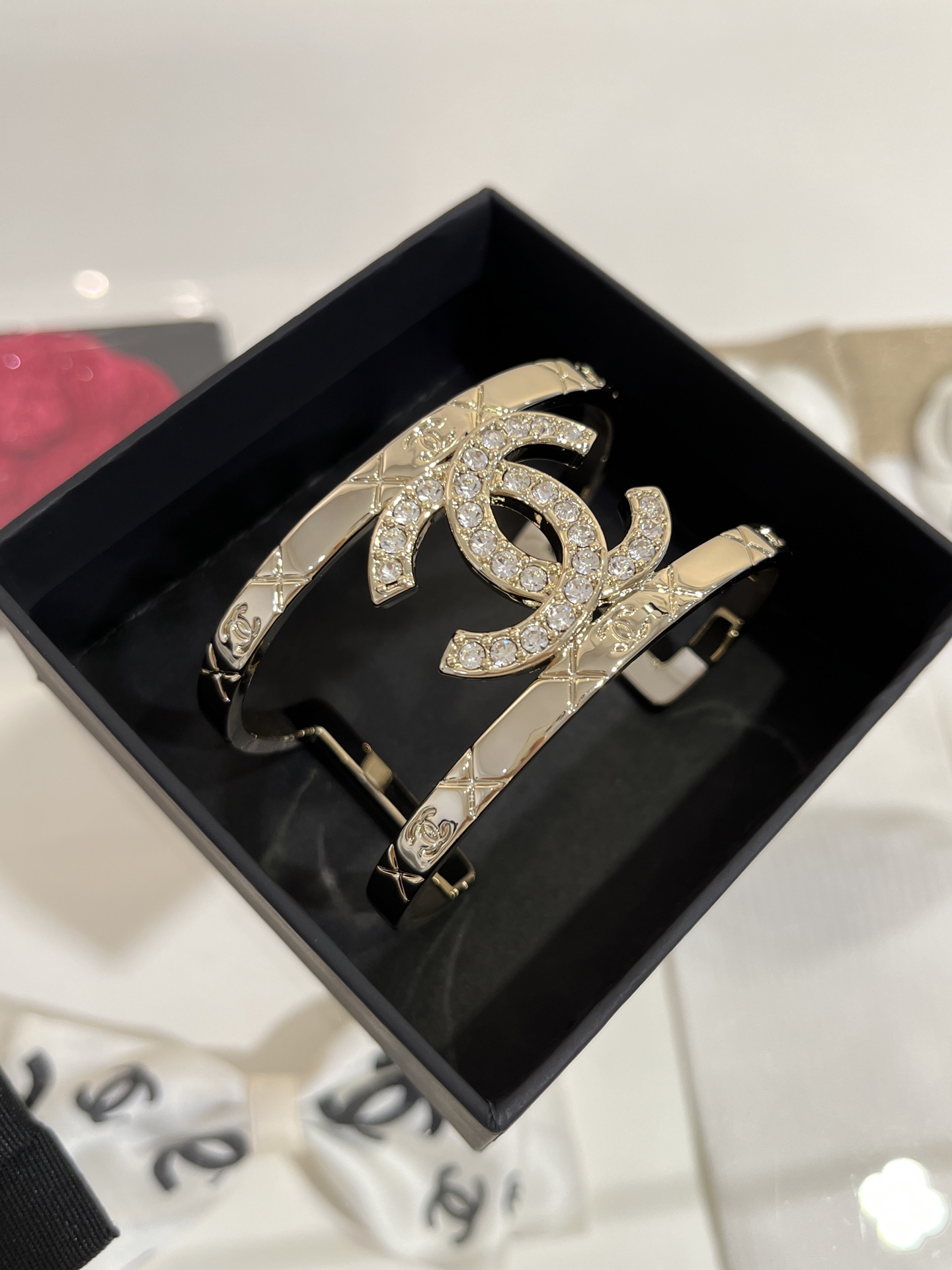 Vòng tay Opening Bracelet Chanel 25P mạ vàng mới, đính kim cương toàn bộ, mặt dây chuyền hình chữ C kép, lưới kim cương rỗng, phiên bản bản rộng, kèm hộp đựng.