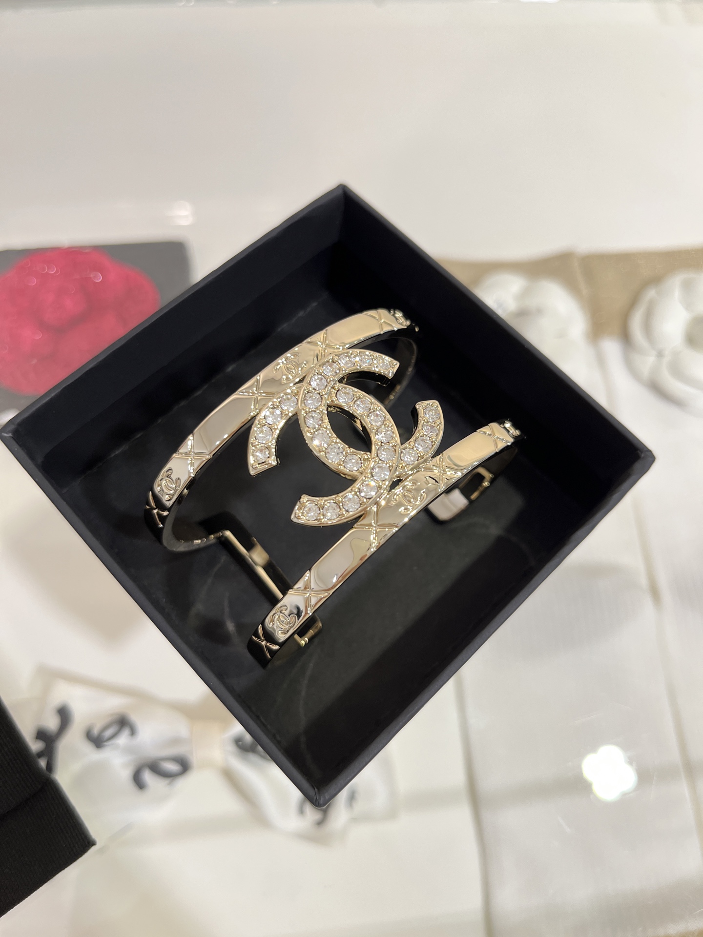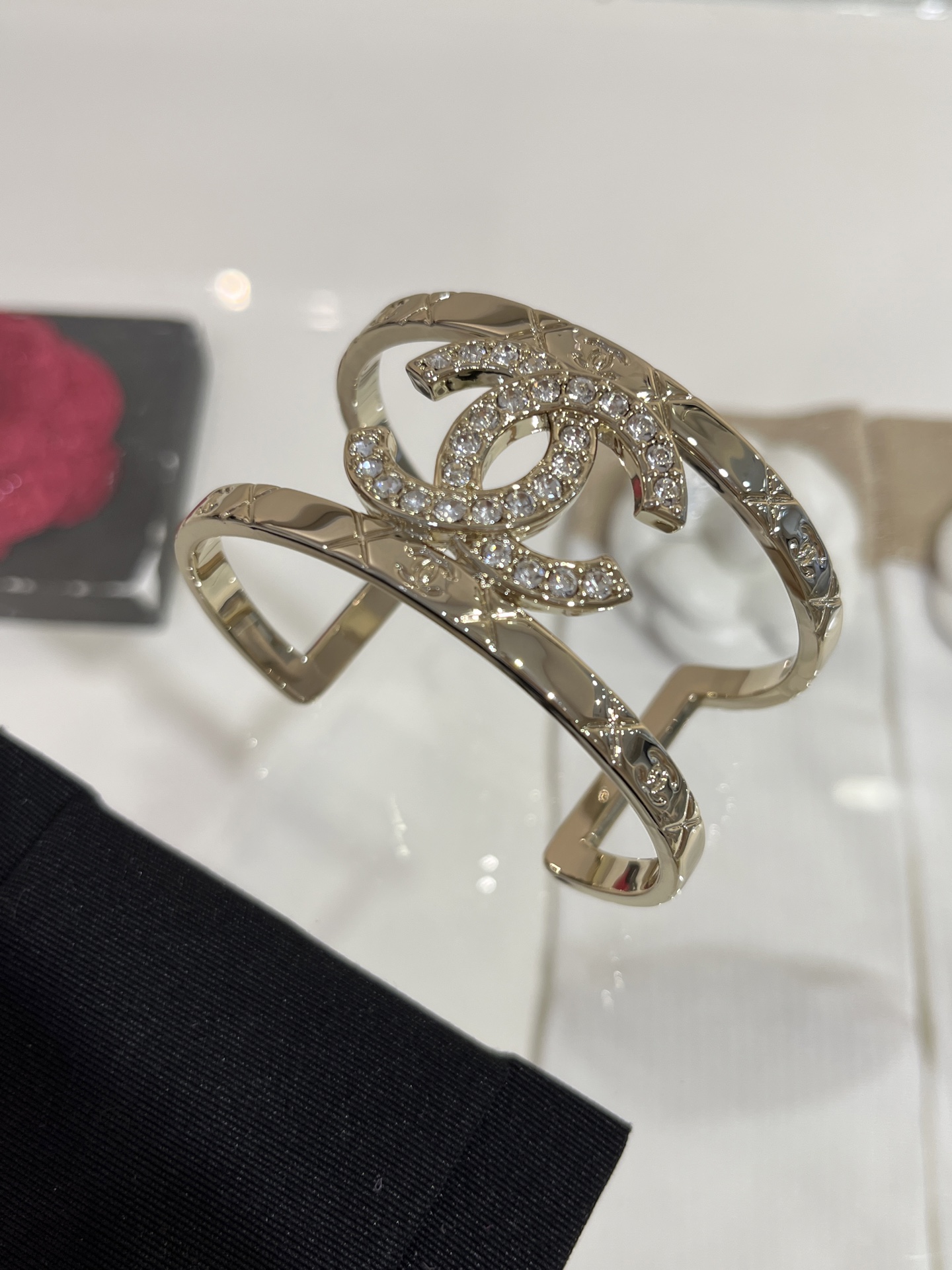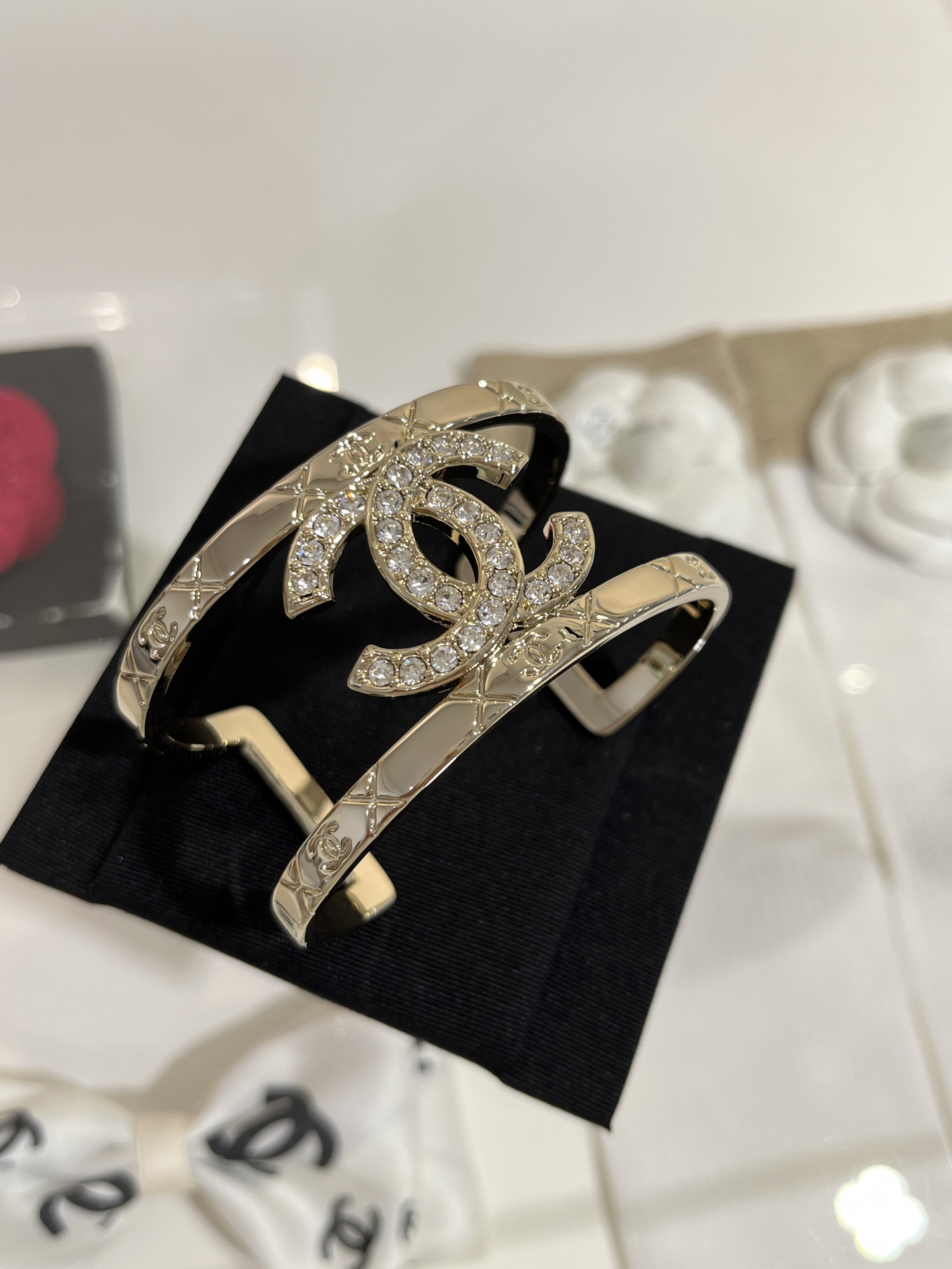 Vòng tay Opening Bracelet Chanel 25P mạ vàng mới, đính kim cương toàn bộ, mặt dây chuyền hình chữ C kép, lưới kim cương rỗng, phiên bản bản rộng, kèm hộp đựng.