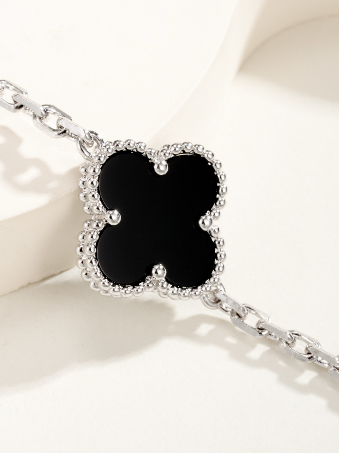 THÔNG SỐ SẢN PHẨM Vòng tay năm cánh hoa onyx đen đá mã não. Đeo vào biến bạn ngay lập tức thành một đóa hoa sang trọng giữa thế giới. Khi cỏ bốn lá gặp ánh sáng laser tím, mọi mặt đều lấp lánh như cực quang mộng mơ, và khi...