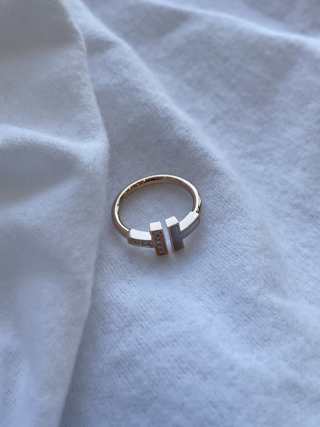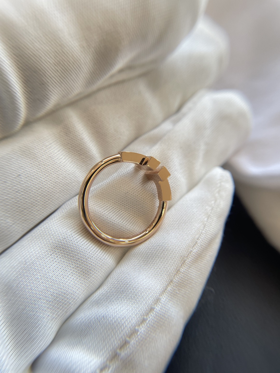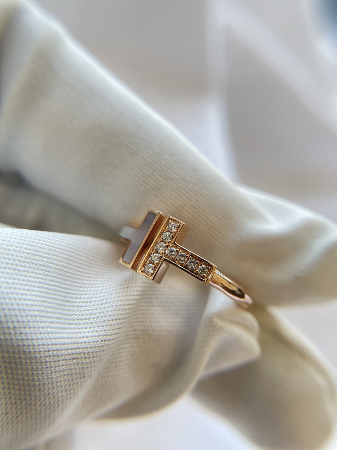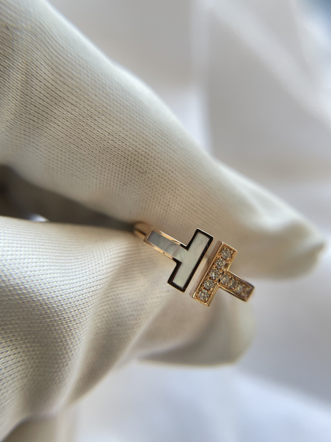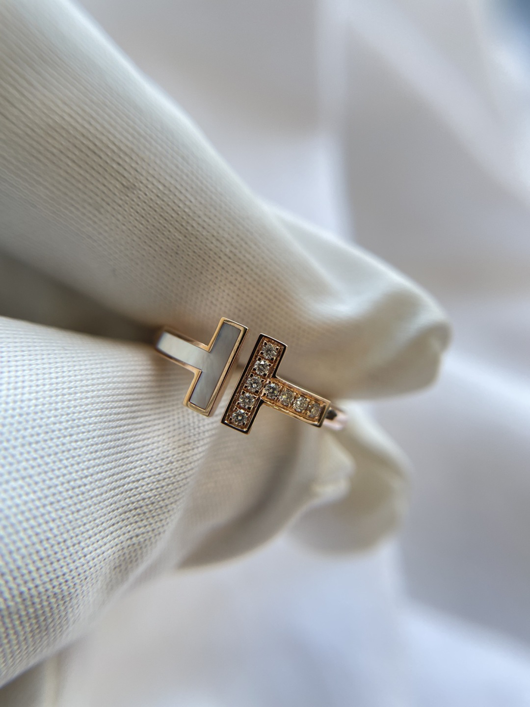 Nhẫn Tiffany T Series đính kim cương hình xoắn ốc. khảm xà cừ tự nhiên và một nửa khảm kim cương sáng chế. Từ chất liệu đến tay nghề, việc đóng mở nhẫn diễn ra rất dễ dàng.