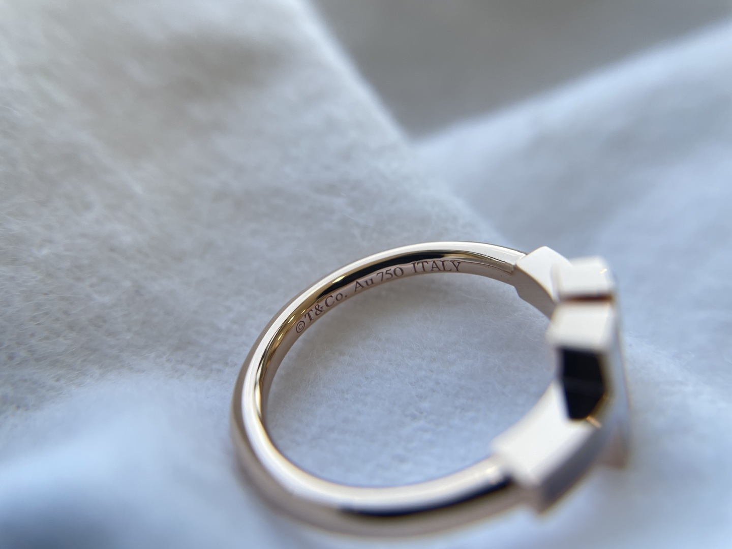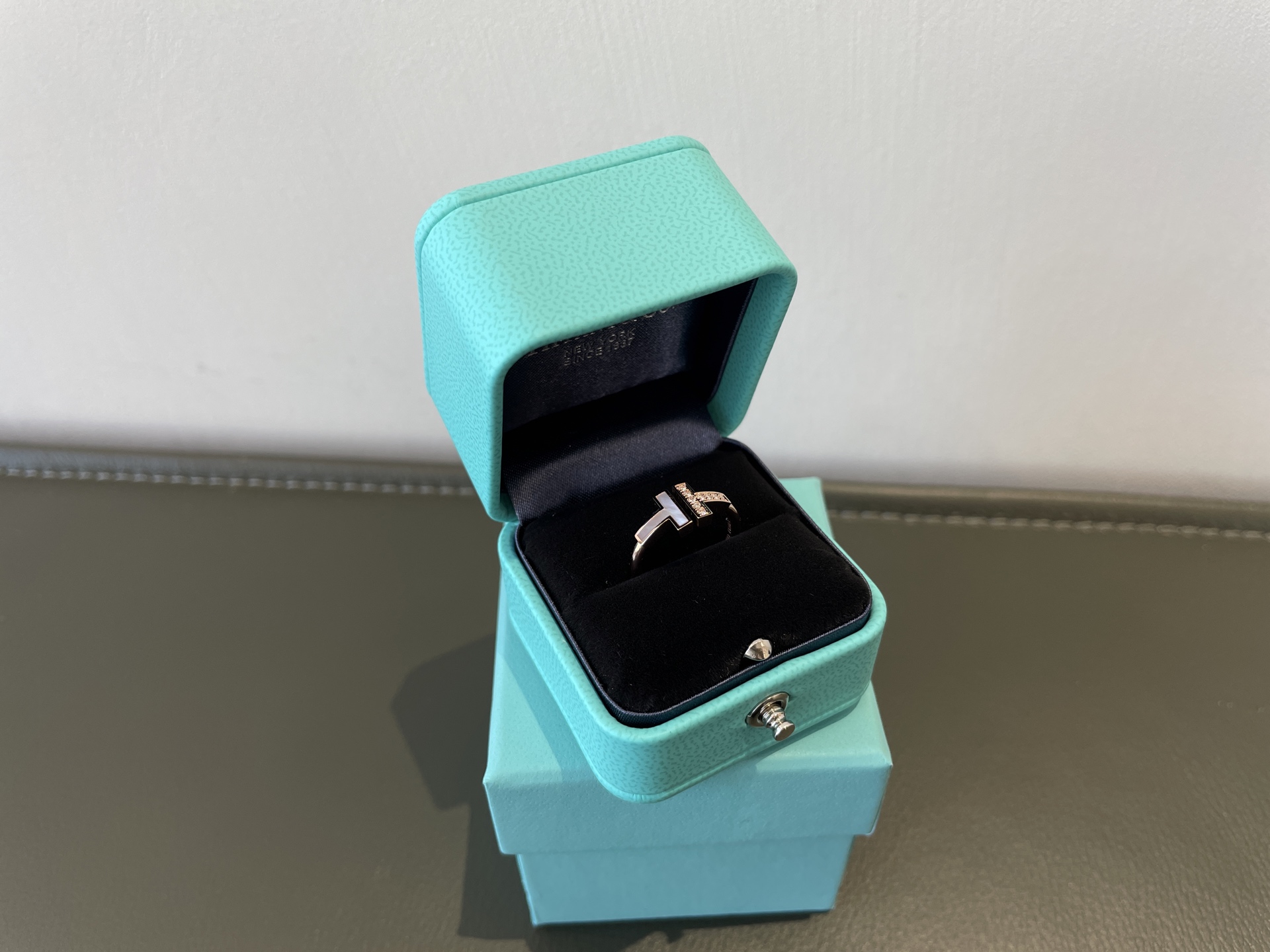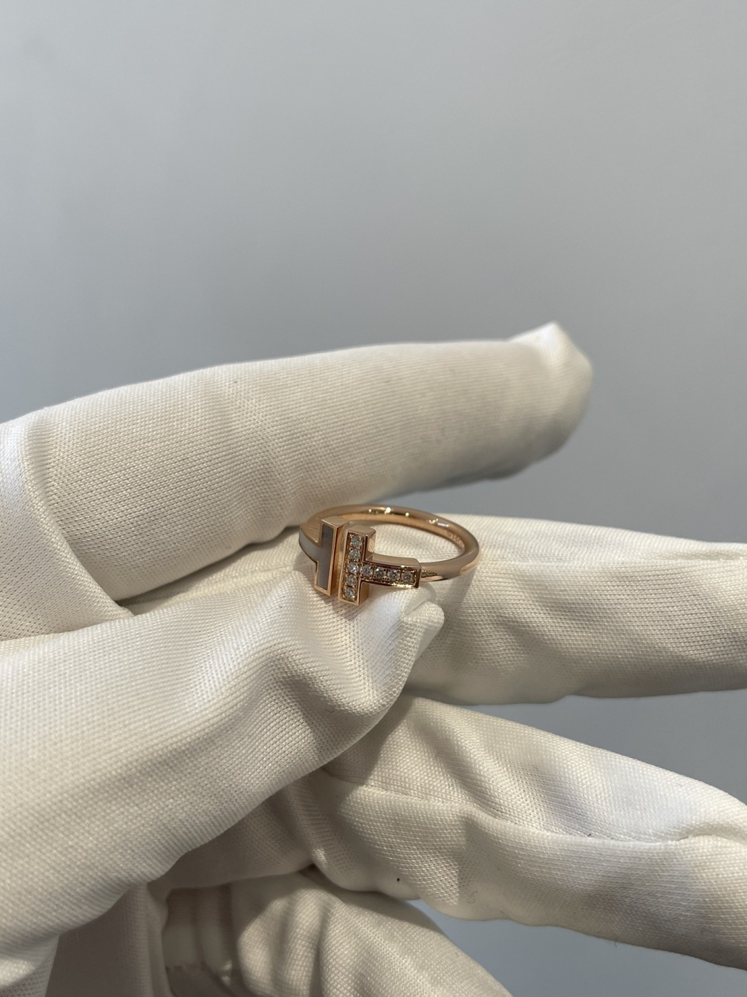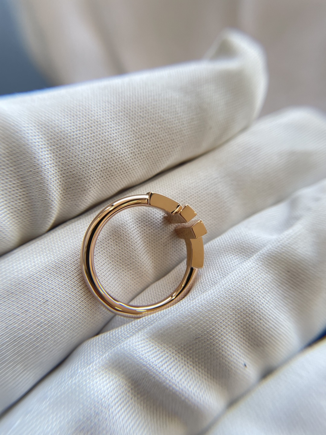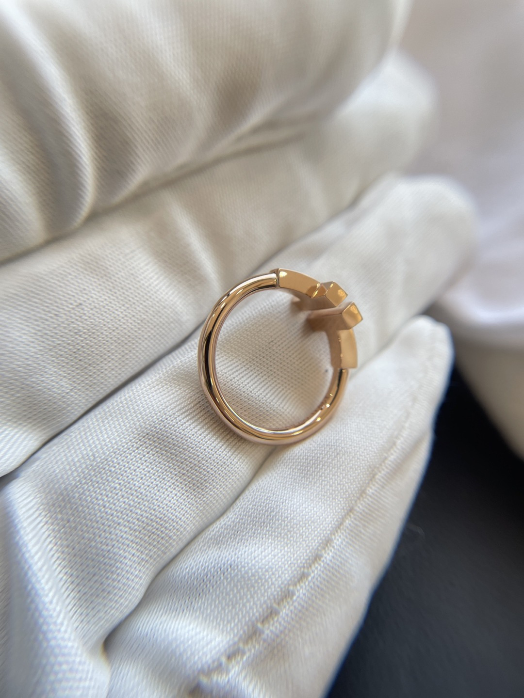 Nhẫn Tiffany T Series đính kim cương hình xoắn ốc. khảm xà cừ tự nhiên và một nửa khảm kim cương sáng chế. Từ chất liệu đến tay nghề, việc đóng mở nhẫn diễn ra rất dễ dàng.
