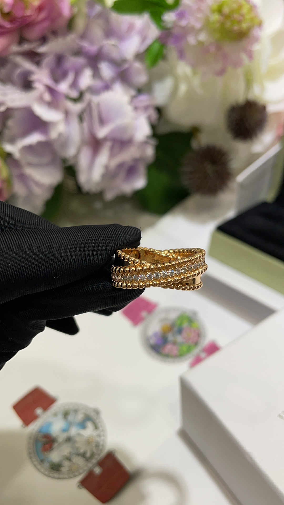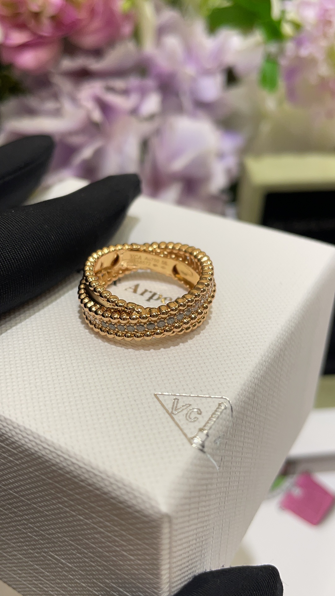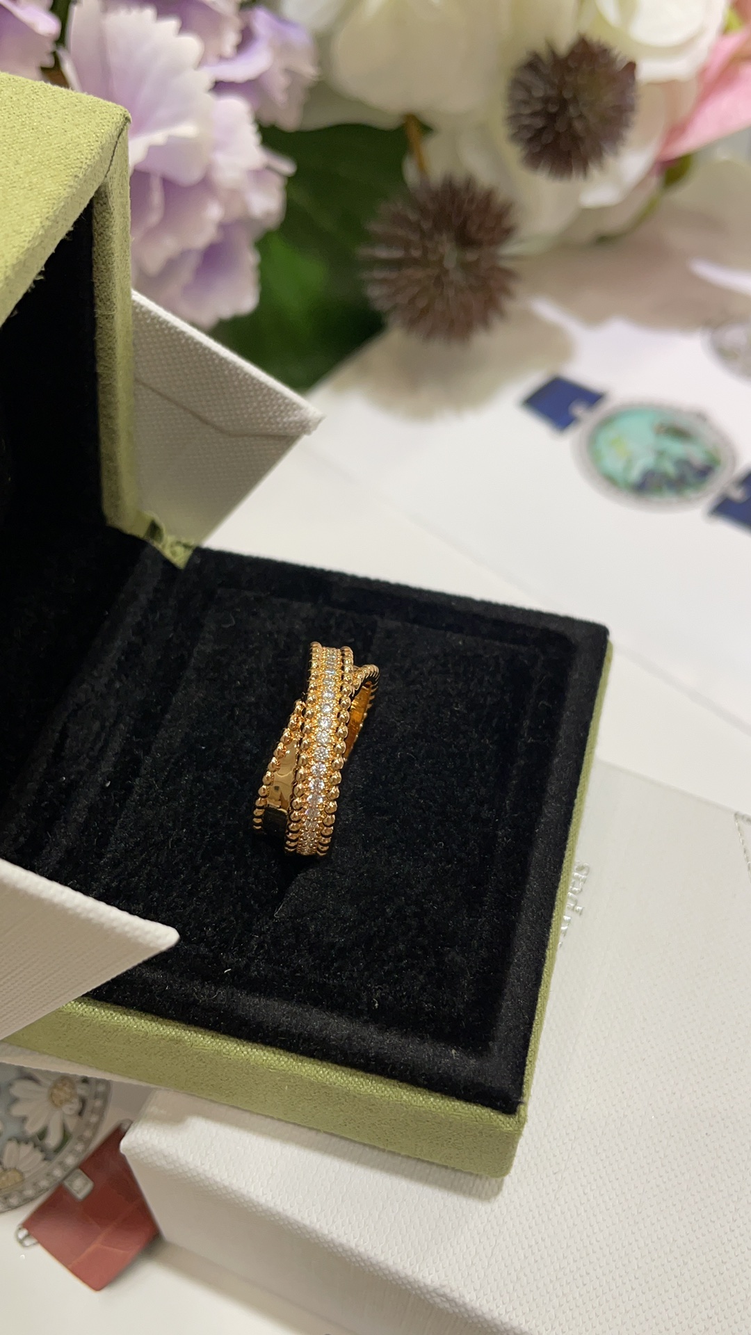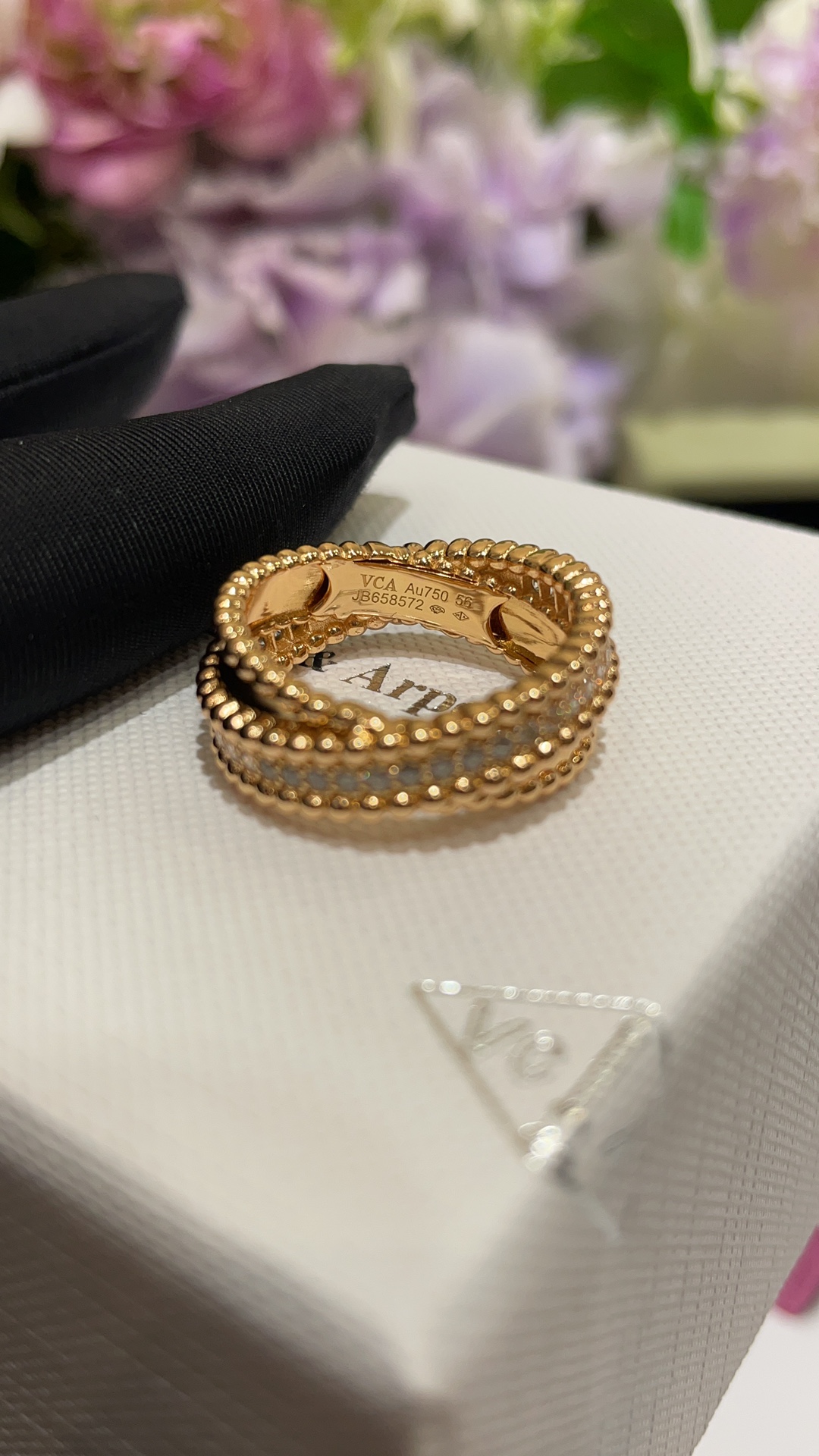 Nhẫn chữ thập hai lớp VCA & Arpes cao cấp, phiên bản vàng hồng, đính hạt vàng. Thiết kế chữ thập hai lớp chồng lên nhau, một nửa đính kim cương và một nửa bề mặt nhẵn. Kết hợp với các viên bi vàng biểu tượng, toát lên vẻ thanh lịch một cách tinh tế. Mang lại cảm giác trang sức cổ điển rất sang trọng. Chất liệu bạc tùy chỉnh với lớp mạ vàng dày ➕ Quy trình CNC khoan cacbon cao
