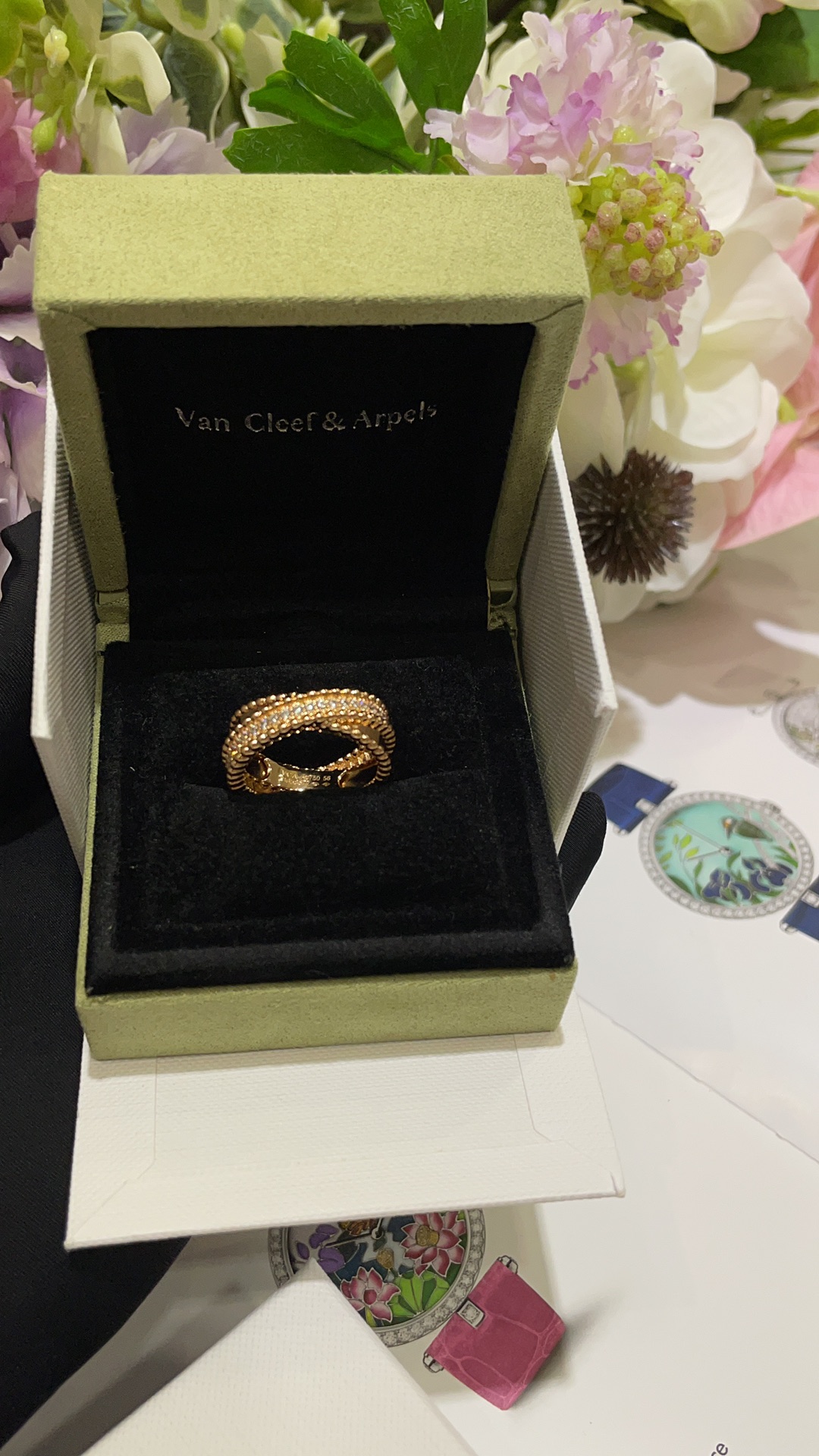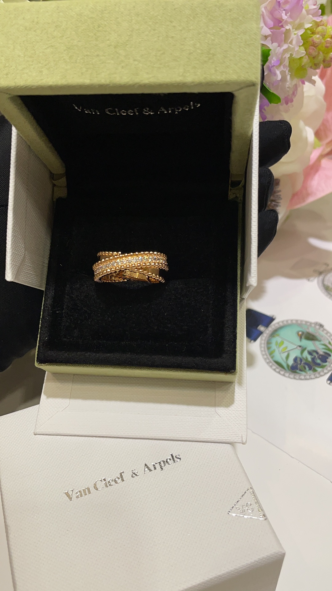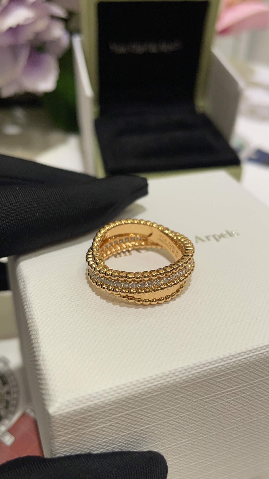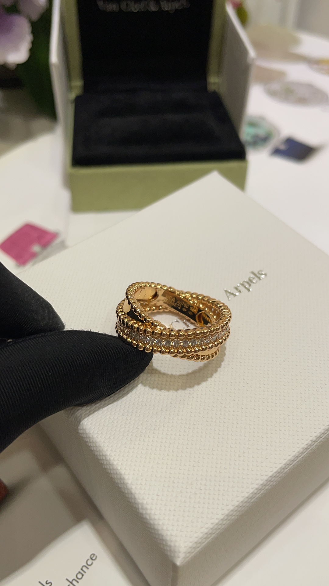 Nhẫn chữ thập hai lớp VCA & Arpes cao cấp, phiên bản vàng hồng, đính hạt vàng. Thiết kế chữ thập hai lớp chồng lên nhau, một nửa đính kim cương và một nửa bề mặt nhẵn. Kết hợp với các viên bi vàng biểu tượng, toát lên vẻ thanh lịch một cách tinh tế. Mang lại cảm giác trang sức cổ điển rất sang trọng. Chất liệu bạc tùy chỉnh với lớp mạ vàng dày ➕ Quy trình CNC khoan cacbon cao