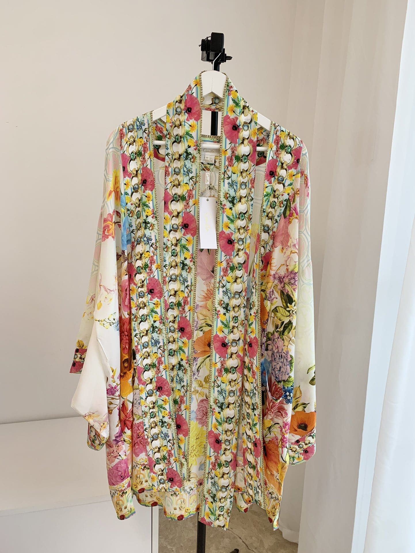 Mẫu xuân hè mới "CAMILLA" nằm trong loạt sản phẩm cao cấp,vải nhập khẩu được làm từ 100% vải lụa nhăn đôi - Được trang trí bằng các họa tiết in hoa định vị độc đáo - Có kiểu dáng siêu dài và thoải mái - Đường viền cổ chữ V sâu - Tay áo loe co giãn - Nút và tab ở giữa túi phía trước - Điểm nhấn pha lê trang trí bằng tay - Đi kèm thắt lưng buộc dây có thể tháo rời